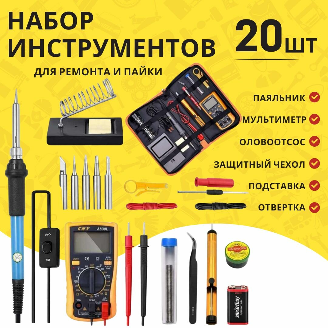 Купить Набор инструментов для пайки и ремонта 20 предметов (паяльник 60, мультиметр в желтой калоше, оловоотсос.) (У)
