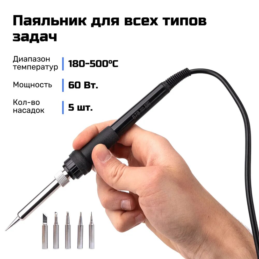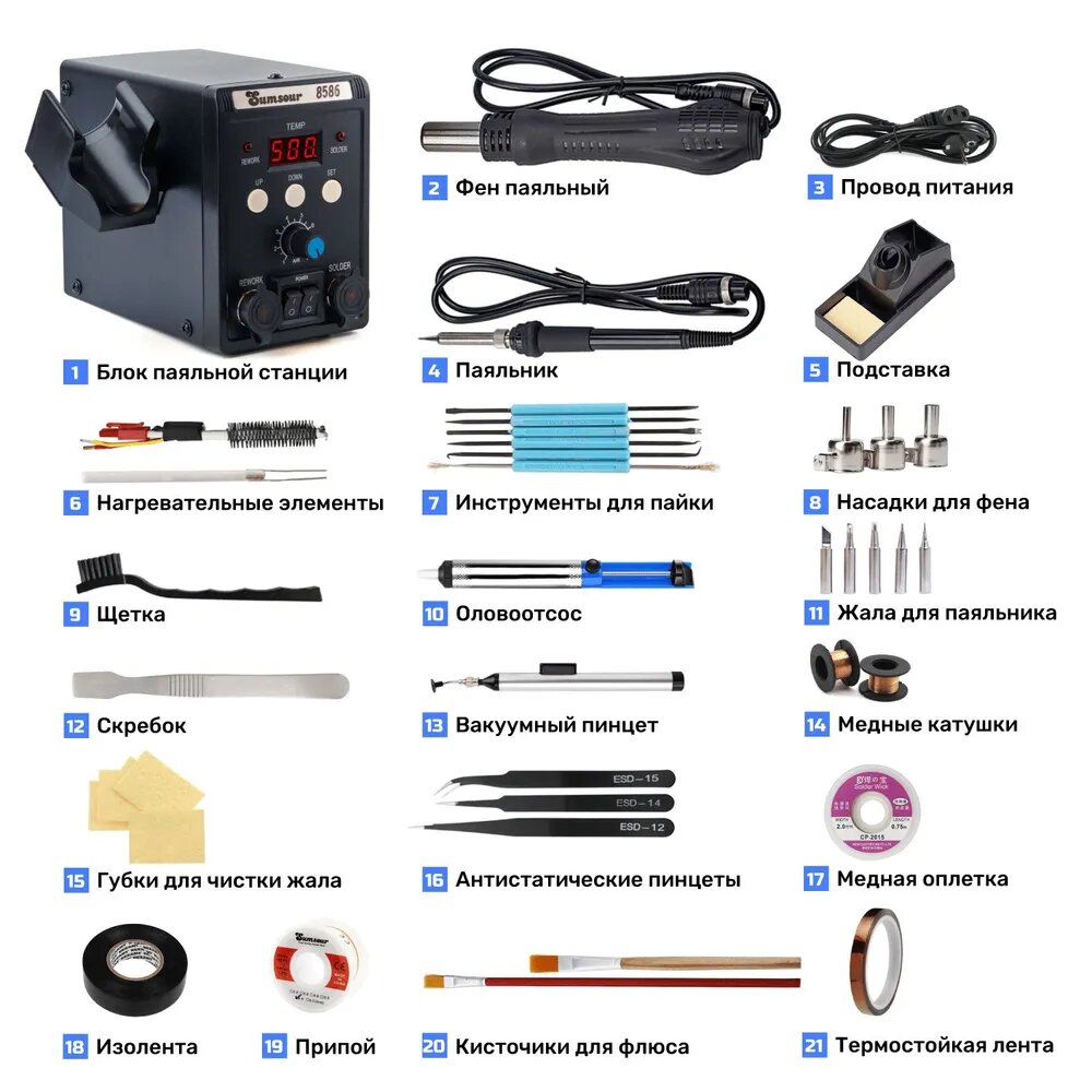 | Комплектация | Блок питания, паяльник и термофен, Подставка для паяльника, 4 сменных насадки для термофена, 5 сменных жал для паяльника, Подставка для паяльника, Антистатический пинцет, Припой 0,6 мм, Медная лента и оплетка для удаления припоя |
