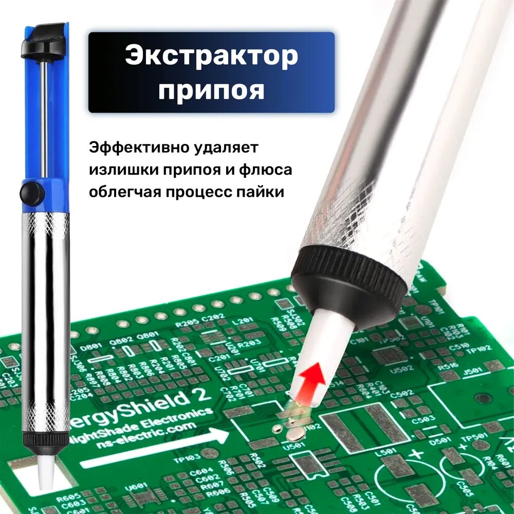 | Комплектация | Блок питания, паяльник и термофен, Подставка для паяльника, 4 сменных насадки для термофена, 5 сменных жал для паяльника, Подставка для паяльника, Антистатический пинцет, Припой 0,6 мм, Медная лента и оплетка для удаления припоя |