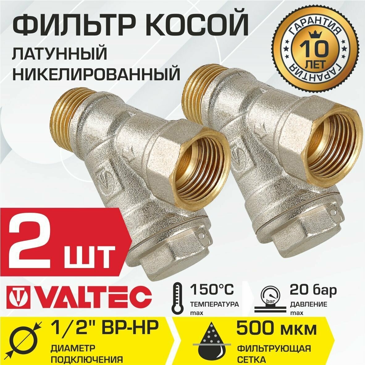 Купить Фильтр косой сетчатый 1/2" ВР-НР (2шт) VALTEC с сеткой 500 мкм, латунный никелированный, VT.191. N.04