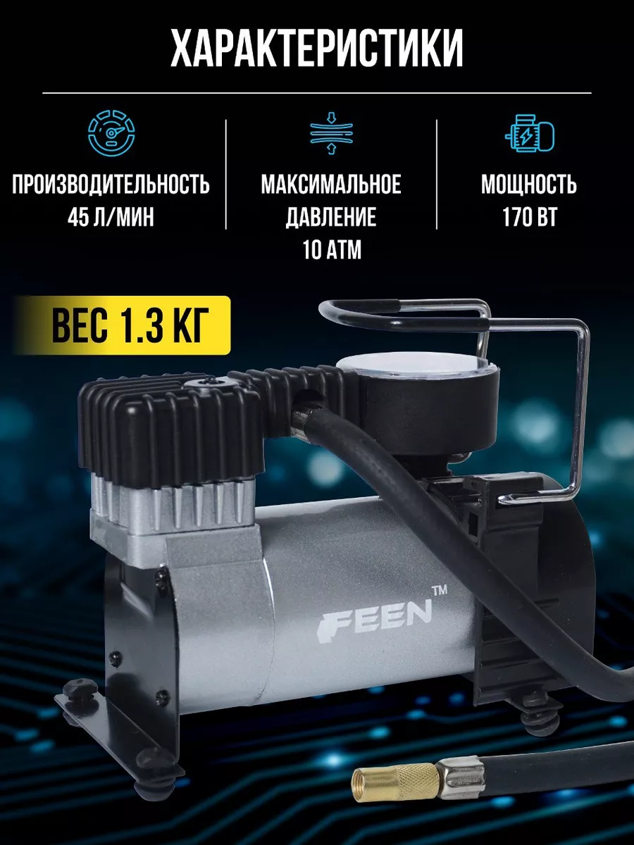 Автомобильный компрессор для шин FEEN 45 л/мин, насос усиленный