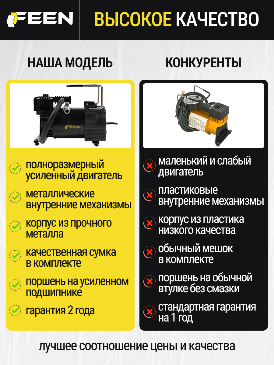 Ниже Вы можете прочитать отзывы на Компрессор автомобильный от прикуривателя 65 л/мин Feen PRO / насос автомобильный от аккумулятора с быстросъемом, ознакомится с подробными характеристиками, посмотреть интересные обзоры и фотографии на Компрессор автомобильный от прикуривателя 65 л/мин Feen PRO / насос автомобильный от аккумулятора с быстросъемом.