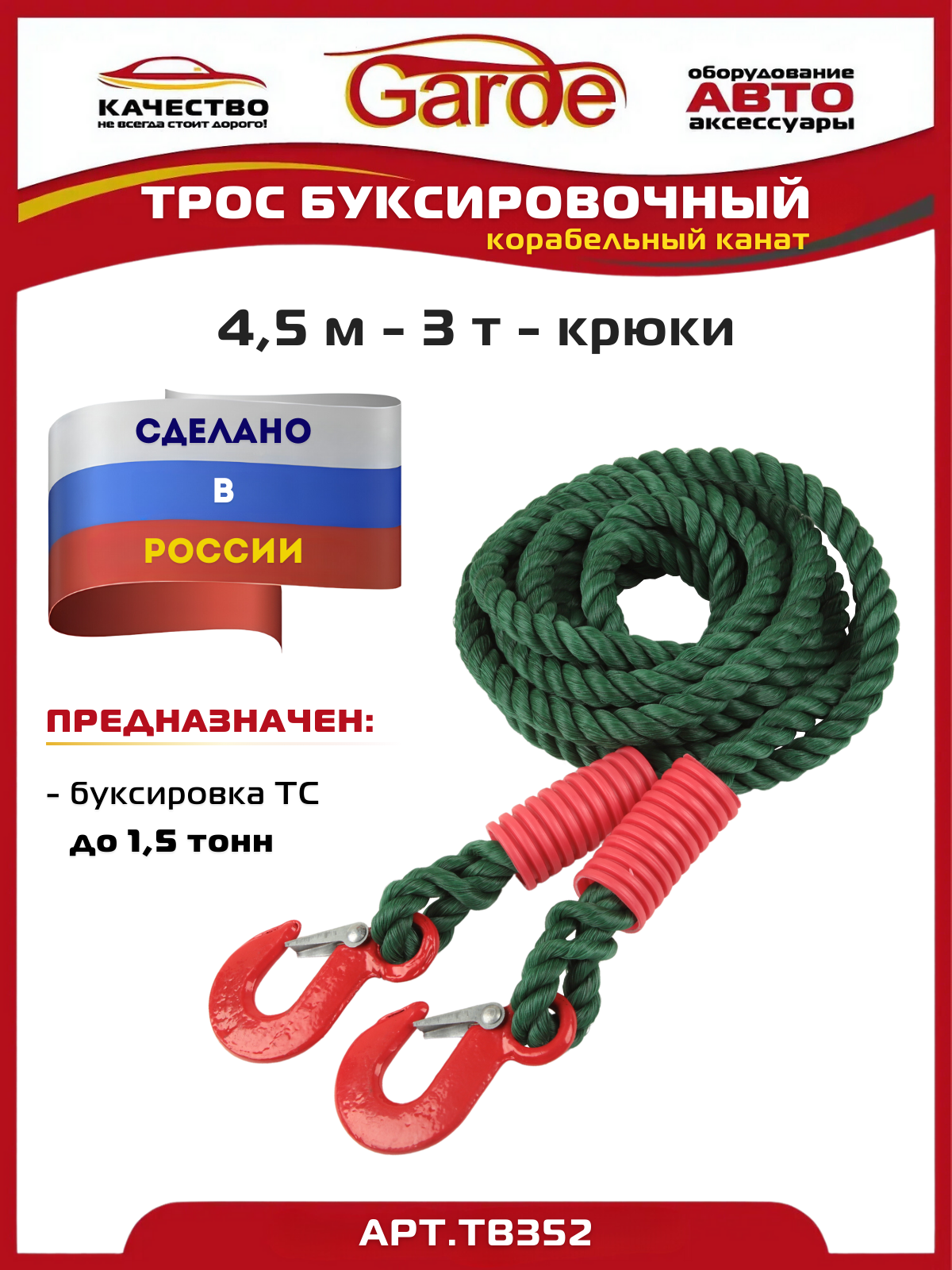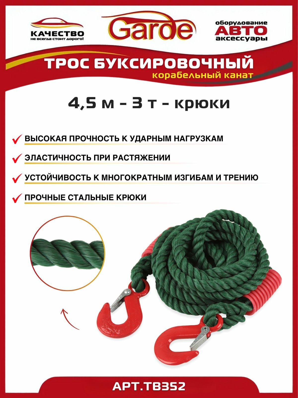 GARDE TB352 Трос буксировочный 3т Garde крюки 4,5м корабельный канат в сумке + перчатки TB352