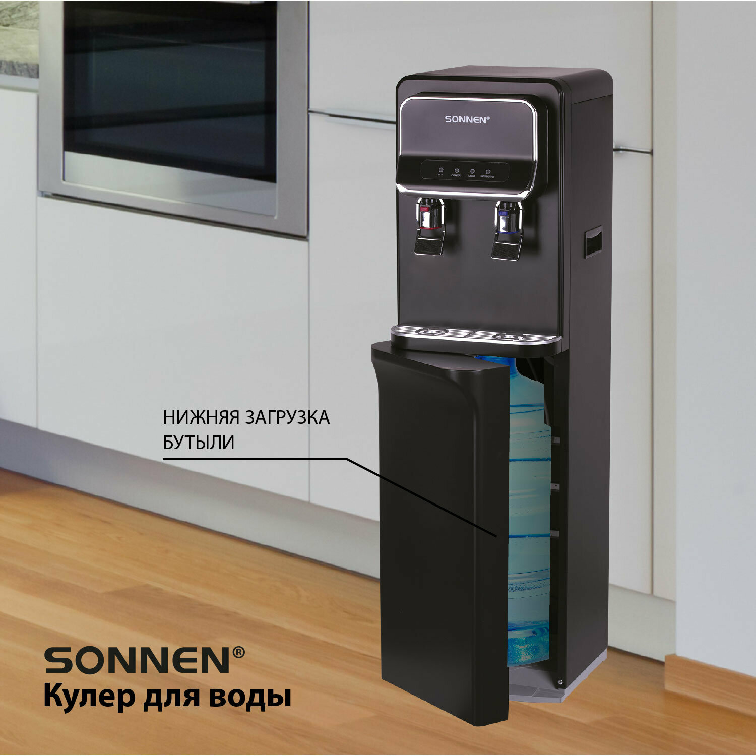 Купить Кулер для воды напольный с нагревом и охлаждением, нижней загрузкой, диспенсер с 2 кранами черный, Sonnen FSE-02WB, 456169