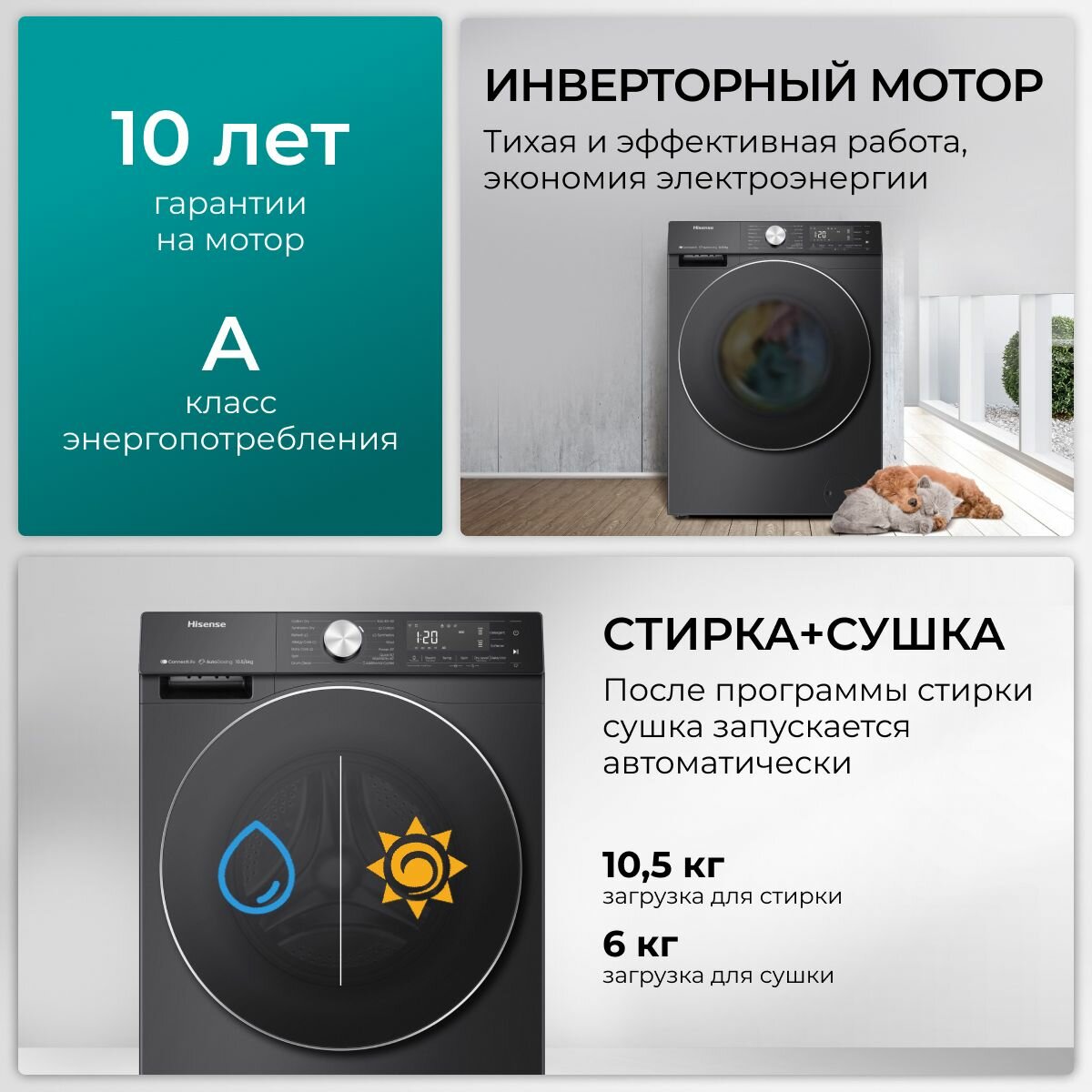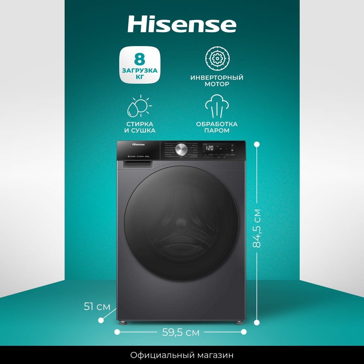 Купить Стиральная машина с сушкой Hisense WD3S8042BB1, загрузка 8/5 кг, 16 автопрограмм, функция обработки паром, инверторный мотор
