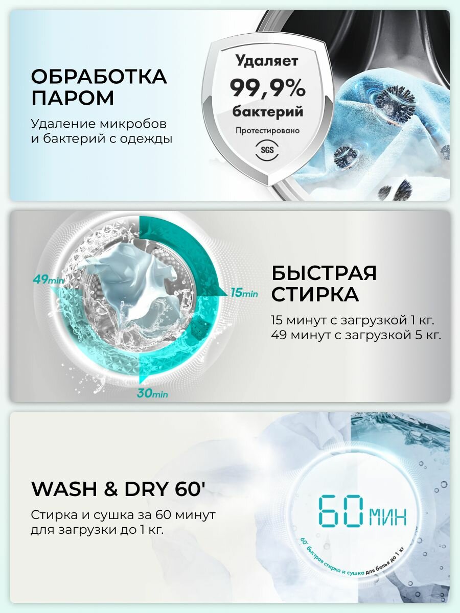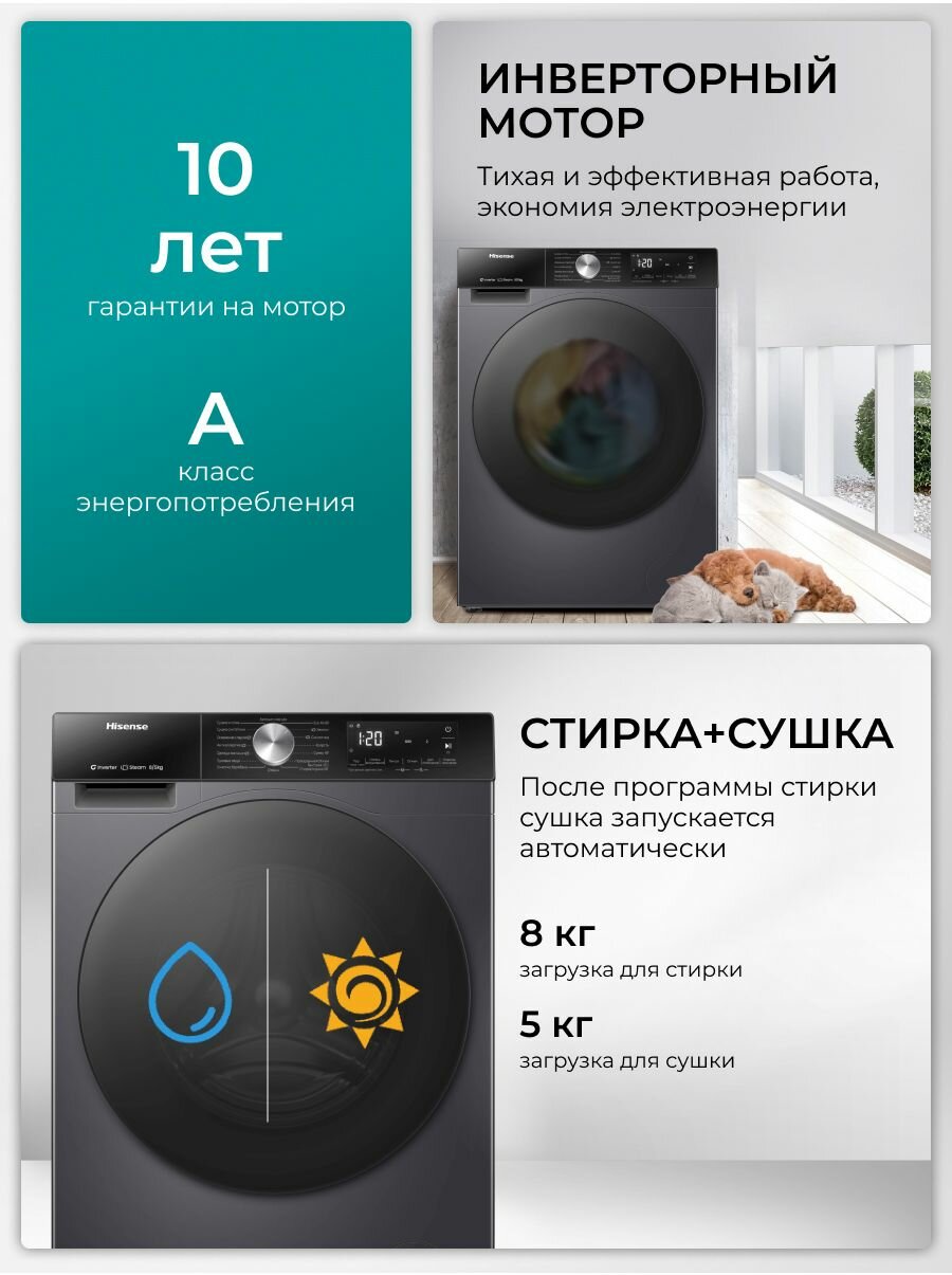 Стиральная машина с сушкой Hisense WD3S8042BB1, загрузка 8/5 кг, 16 автопрограмм, функция обработки паром, инверторный мотор интересное: