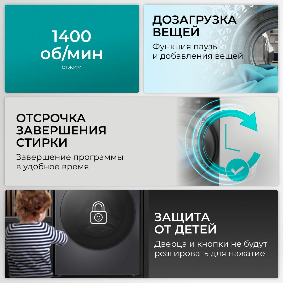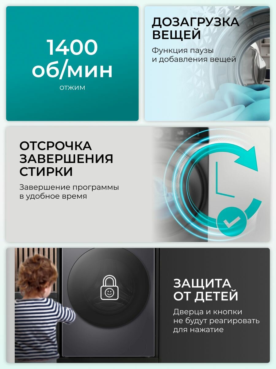 | Программы | быстрая стирка / дополнительное полоскание / ежедневная стирка / замачивание / отжим / полоскание / предварительная стирка / предотвращение сминания / стирка детских вещей / стирка паром / стирка пуховых вещей / стирка смешанных тканей / стирка спортивной одежды / стирка хлопка / стирка шерсти |