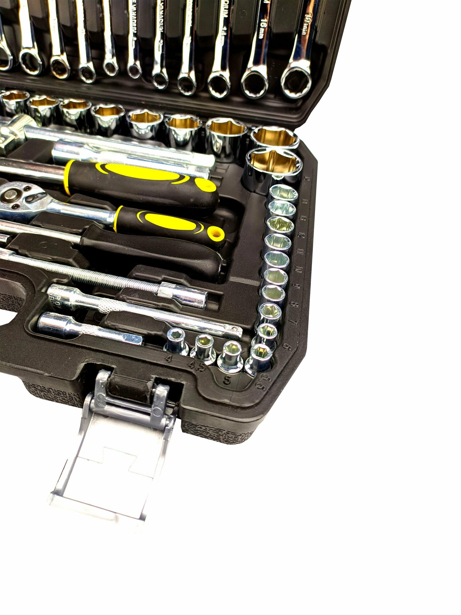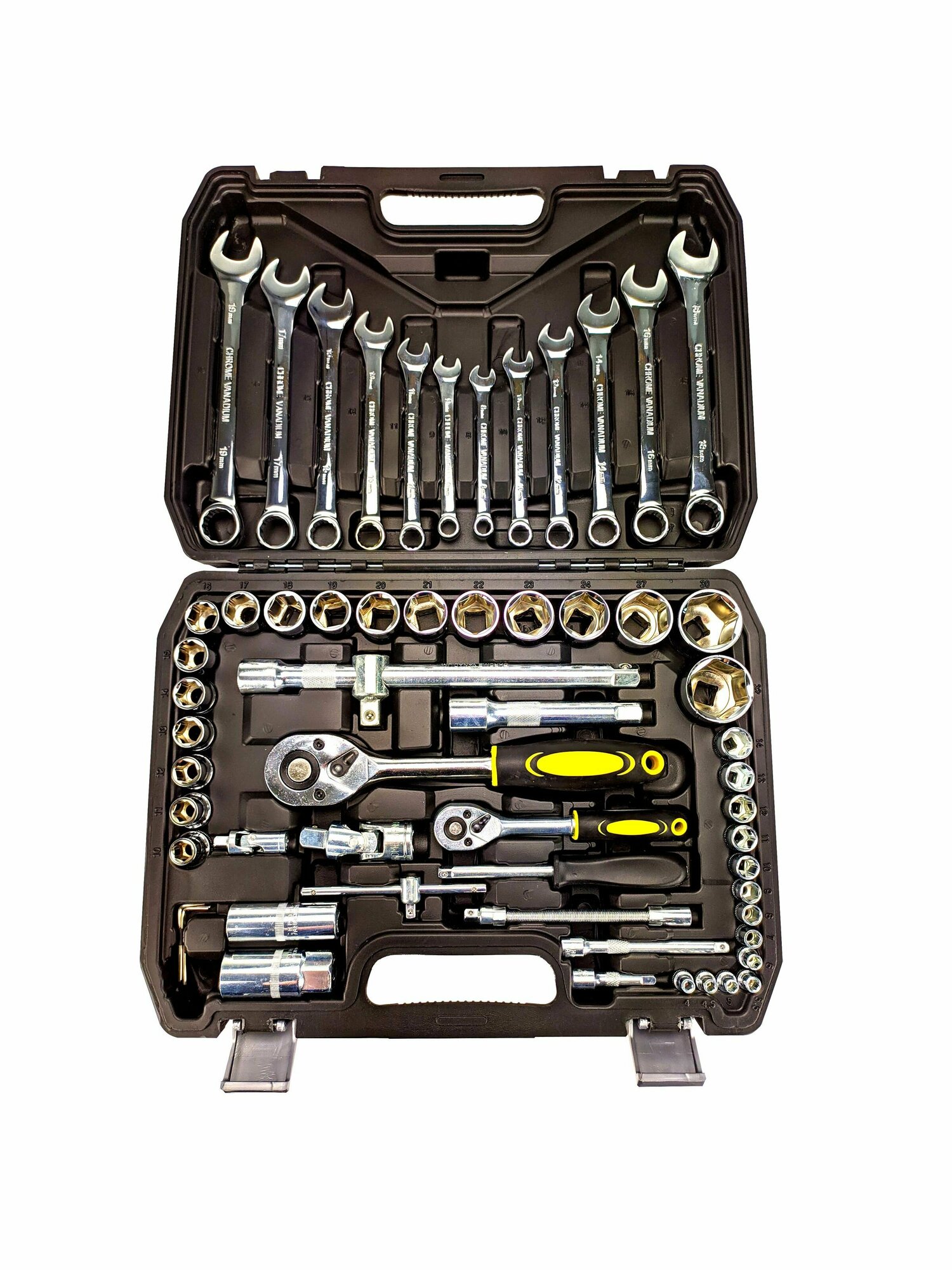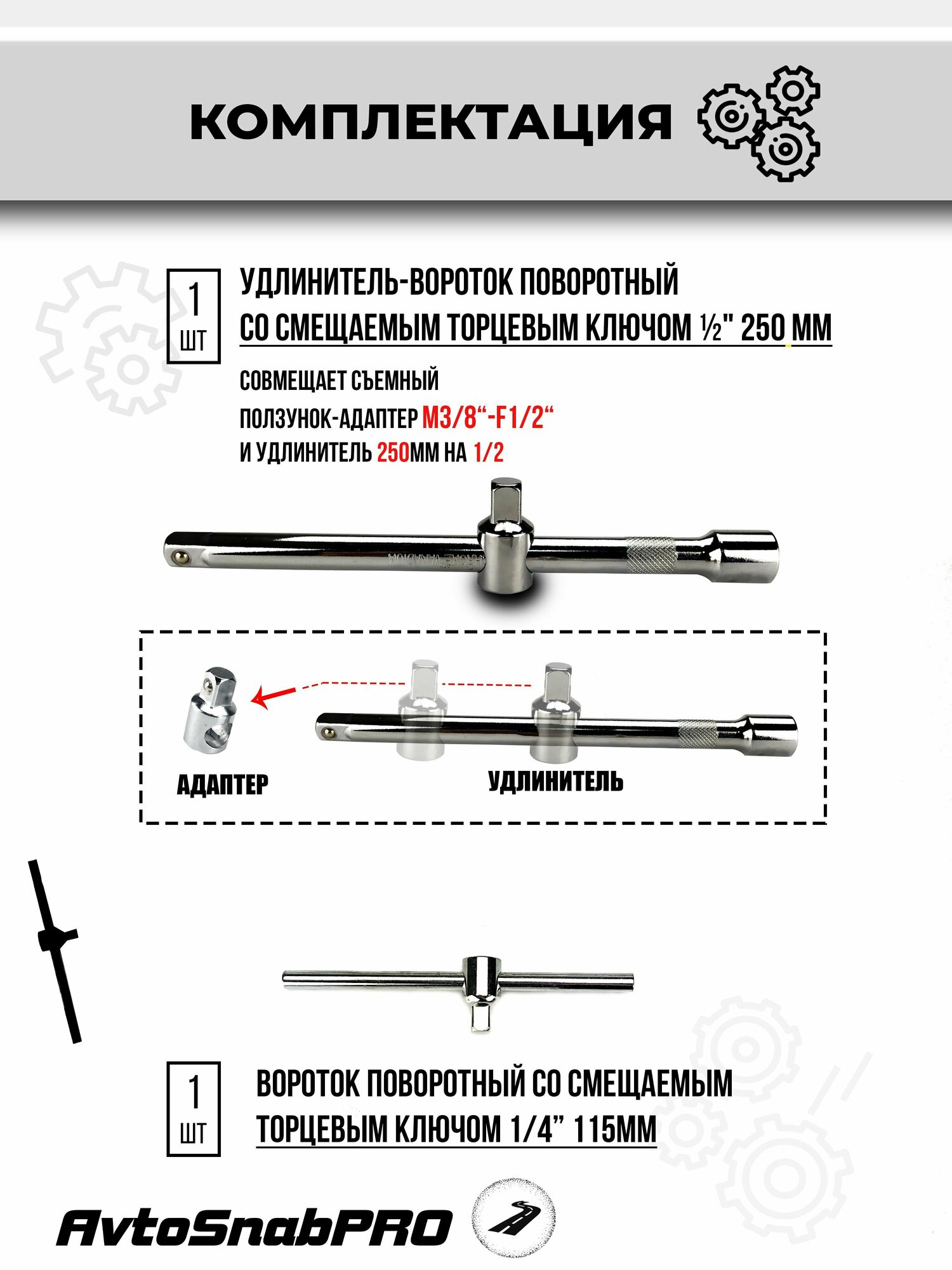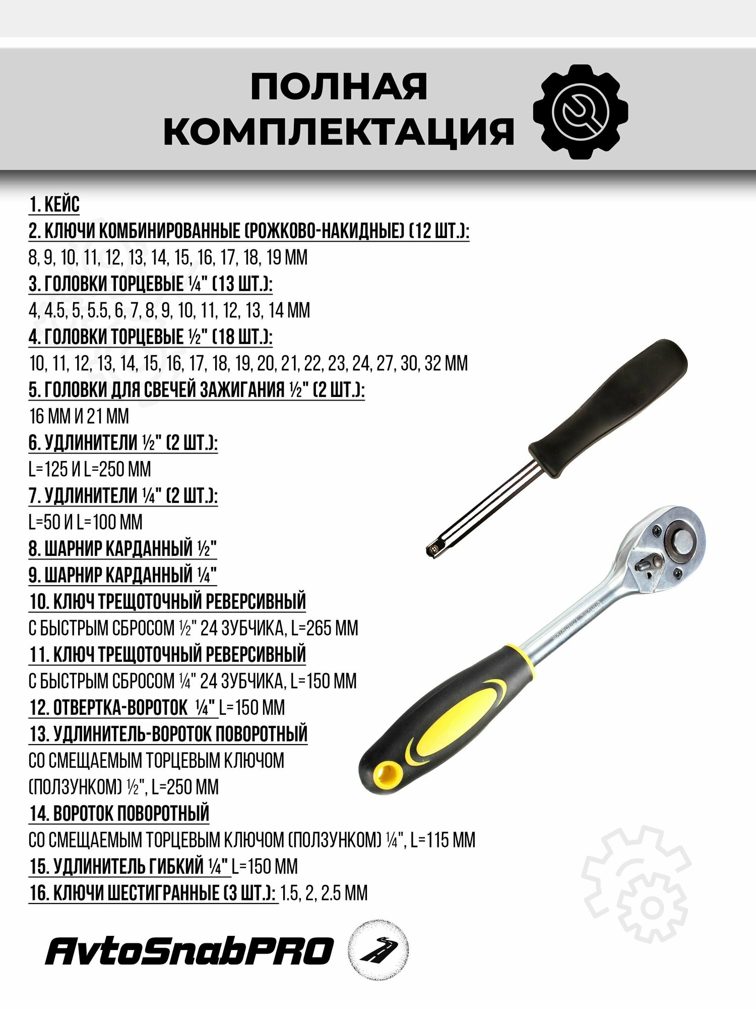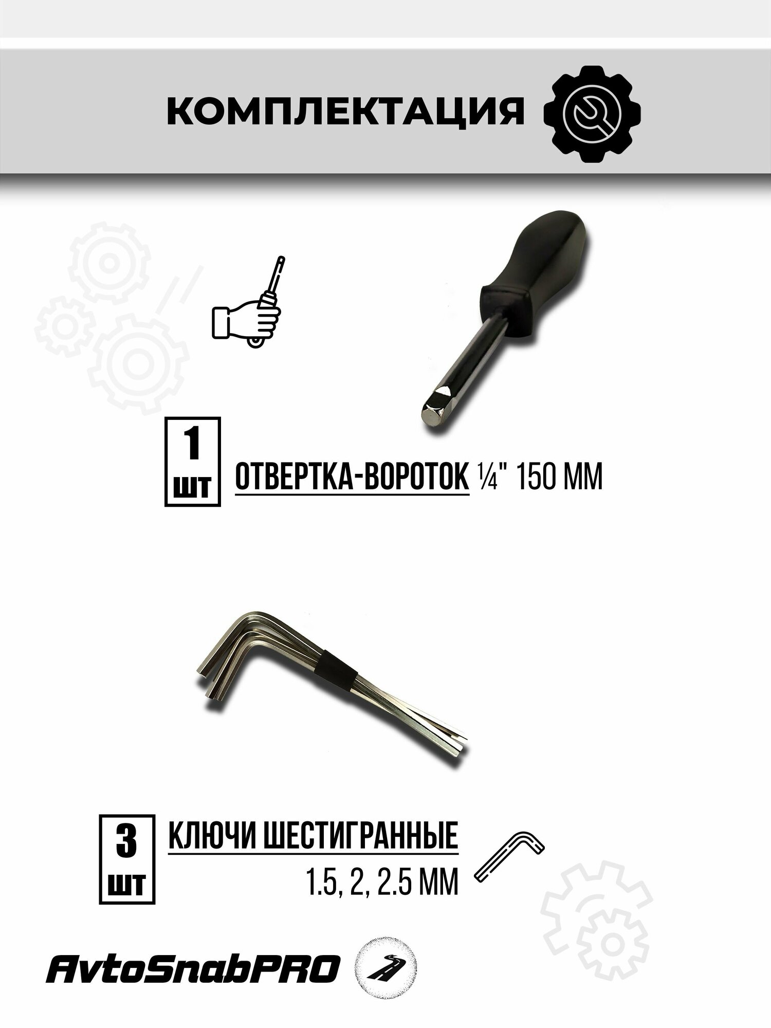 | Инструменты в комплекте | вороток для головок / ключи гаечные / ключи имбусовые (шестигранные) / отвёртки / рукоять для бит / рукоять для головок / трещотка |