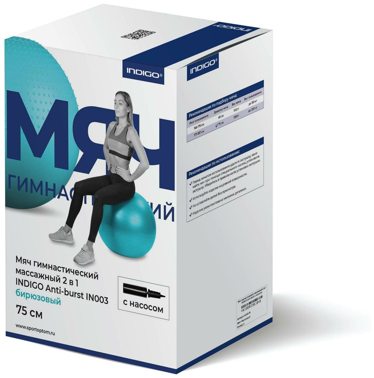 Мяч гимнастический массажный 2 в 1 IN003 INDIGO Anti-burst с насосом Бирюзовый 75см интересное: