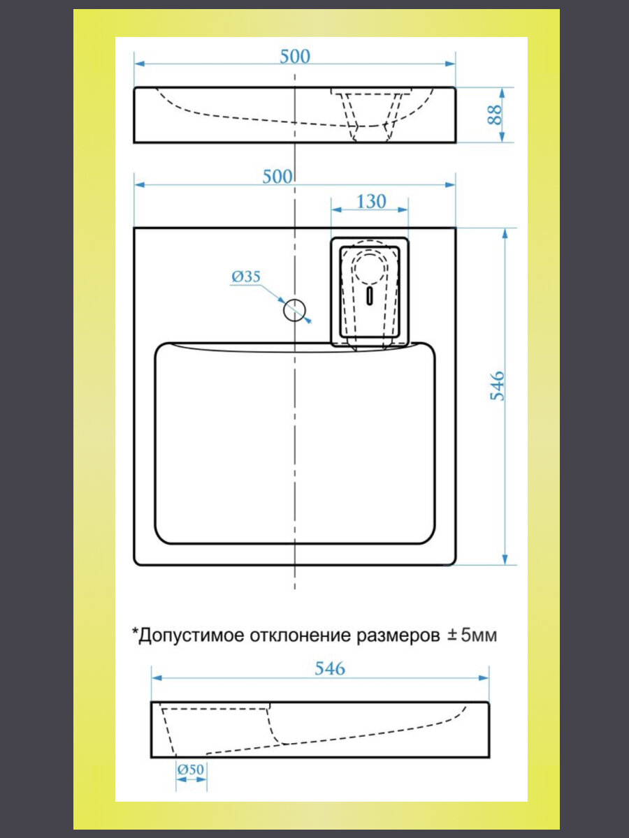 | Расположение размеченного отверстия под смеситель | в центре |