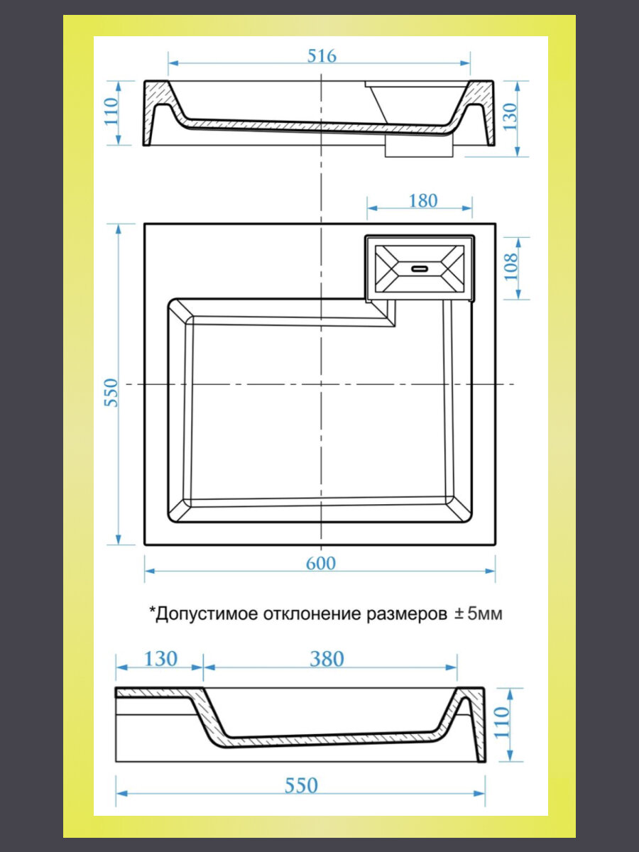| Расположение размеченного отверстия под смеситель | в центре |