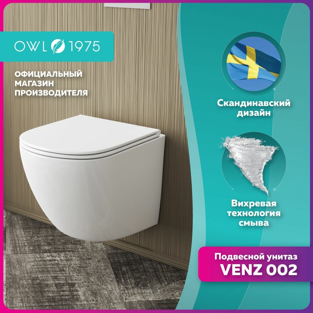 Купить Унитаз подвесной безободковый OWL 1975 Venz с вихревой и сиденьем микролифт 002 (система смыва Торнадо)