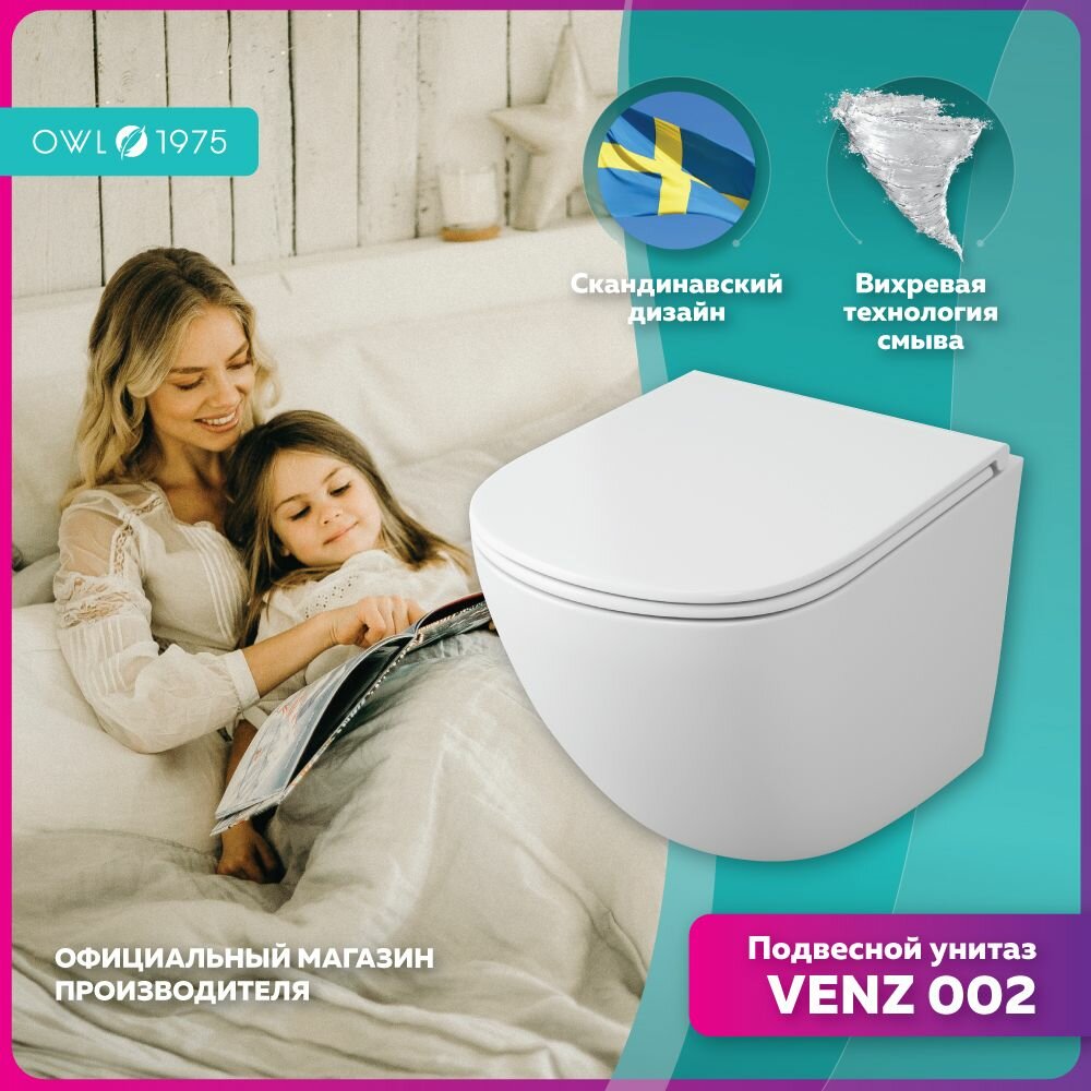 Унитаз подвесной безободковый OWL 1975 Venz с вихревой и сиденьем микролифт 002 (система смыва Торнадо) интересное: