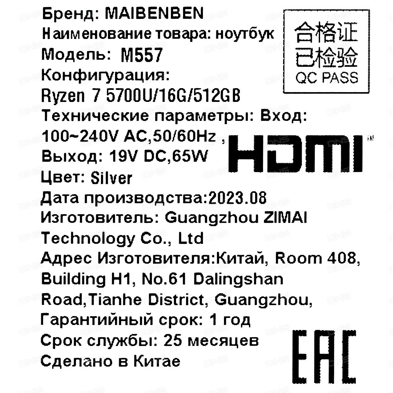 Maibenben M557 [M5571SB0LSRE0] silver 15.6" {FHD Ryzen 7 5700U/8Gb/512Gb SSD/DOS}