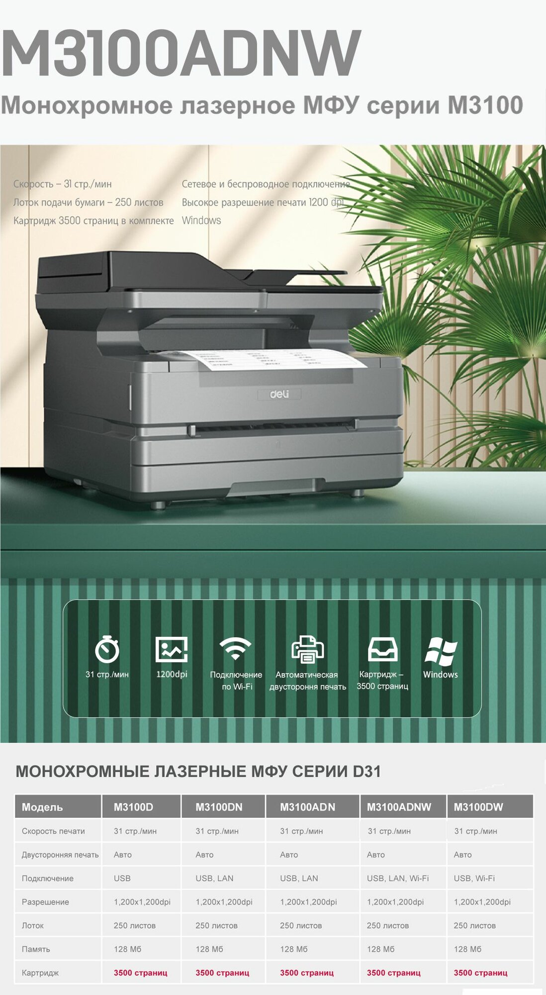 МФУ лазерное Deli M3100DN, ч/б, А4, высокоскоростная печать, принтер, сканер, копир, гарантия 2 года