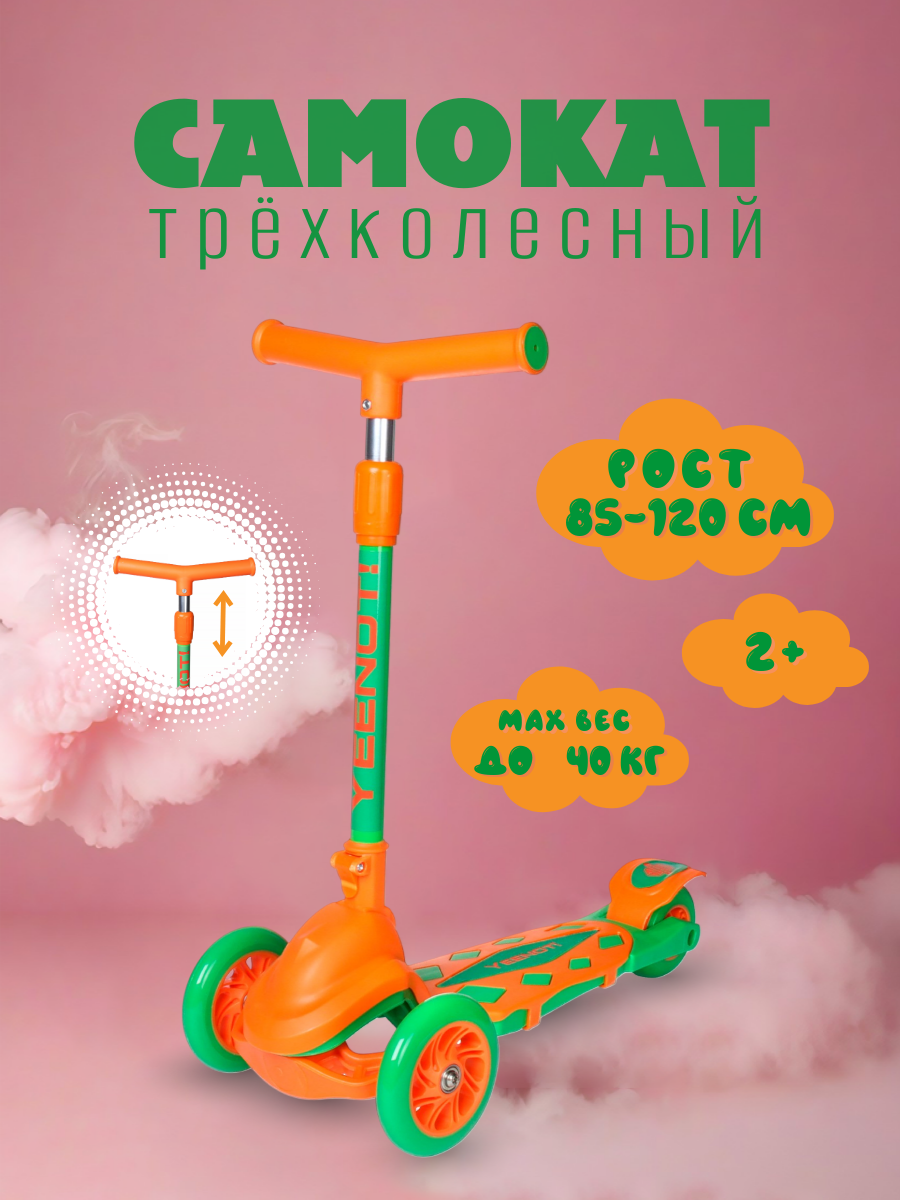 Купить Самокат детский трехколесный Yeenot "Резкий", регулируемая складная ручка, колеса 120 и 95 мм, нагрузка до 40 кг, оранжевый / 1 шт.