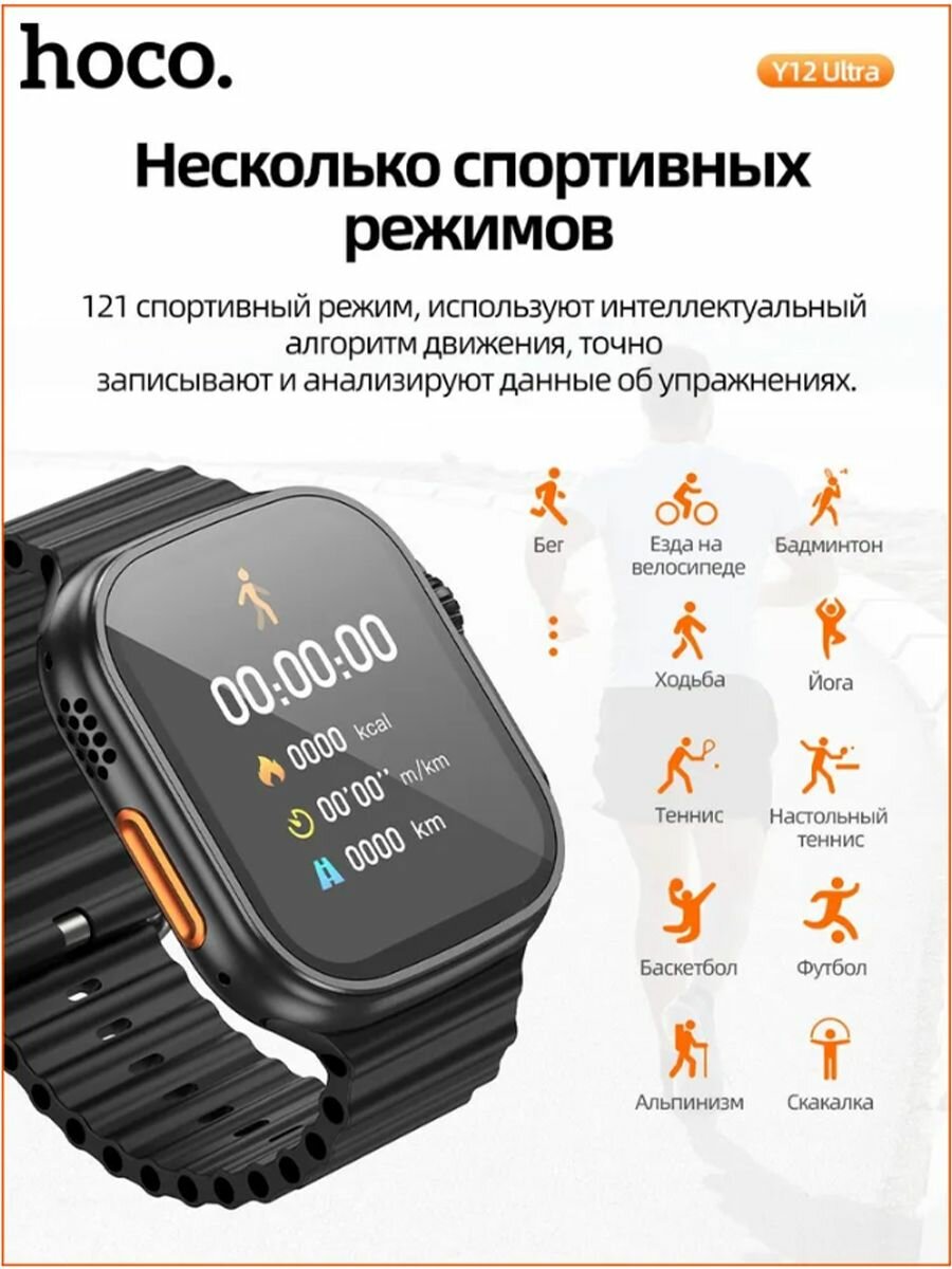 Смарт-часы Hoco Y12 Ultra, 1.96, 240х280, Bt5.0, 320 мАч, поддержка вызова,Lightning,чёрные Hoco 988
