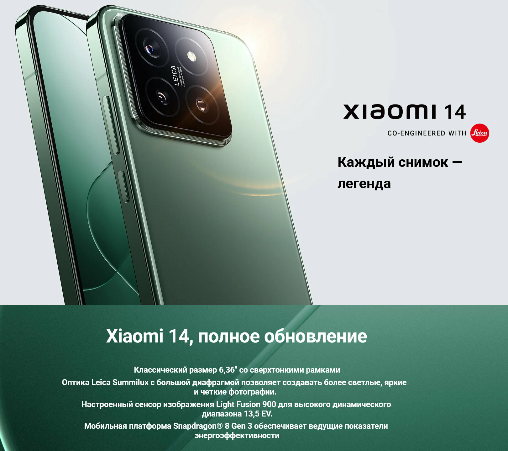 Смартфон Xiaomi 14 12/512 ГБ RU, Dual: nano SIM + eSIM, зеленый