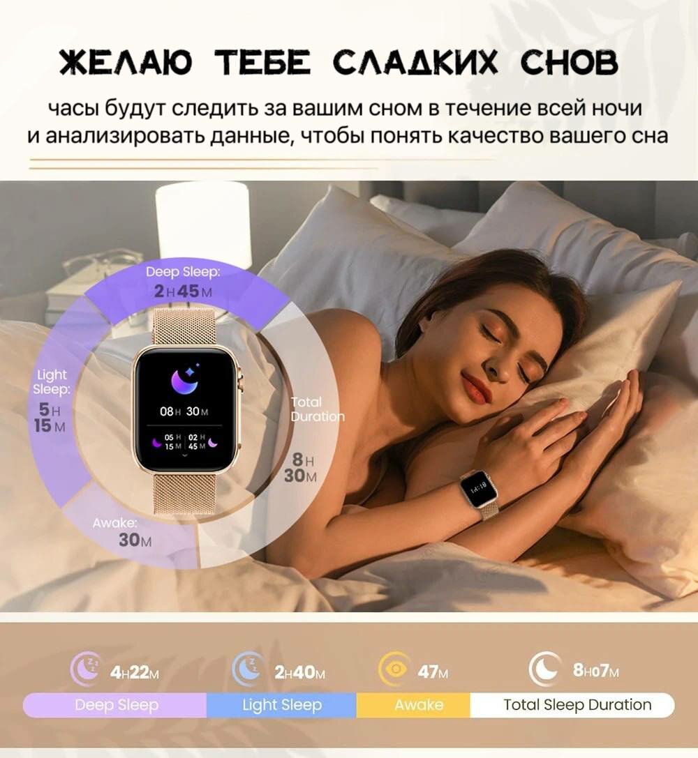 | Мониторинг | калорий, пульса, сна, температуры тела, термометр, тонометр, уровня кислорода в крови, уровня стресса, физической активности, частоты дыхания |