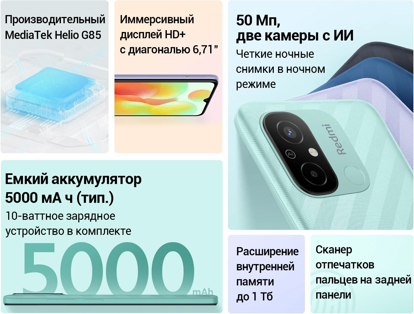 смартфон-Redmi 12C-6GB/128GB blue Окта-ядерный процессор Высокая производительность и длительное время автономной работы Двойная камера 50 МП UHD