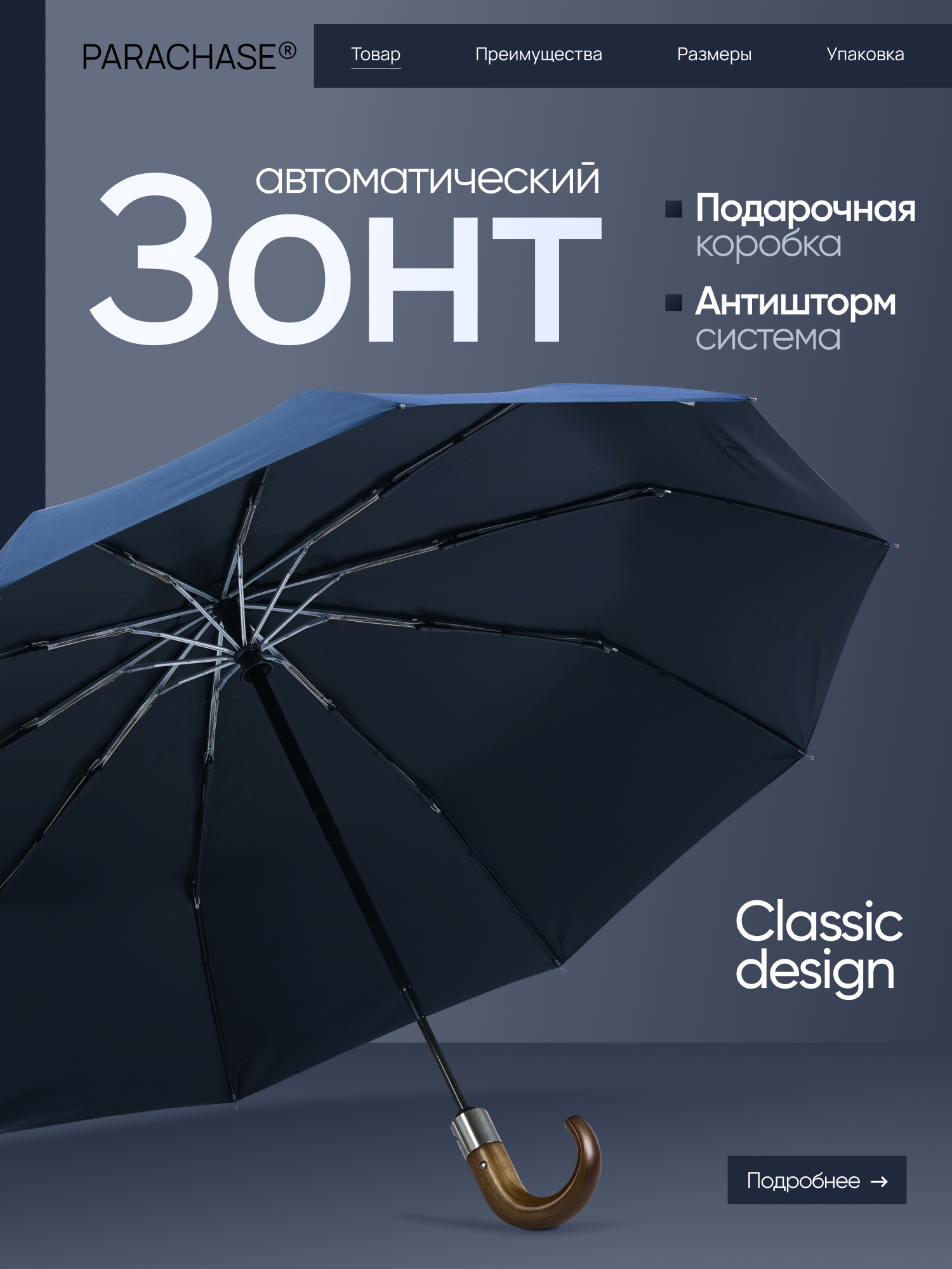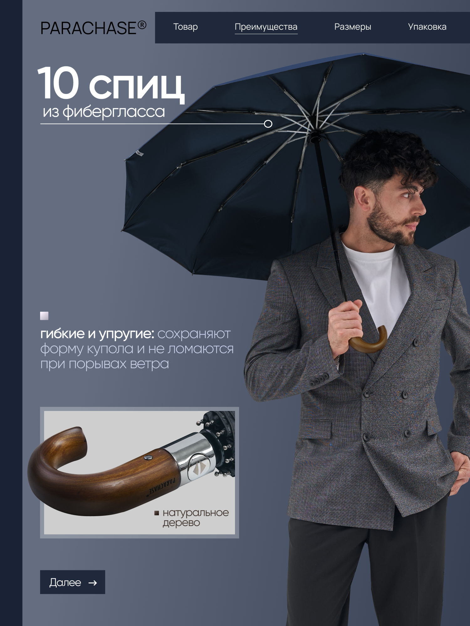Зонт мужской автомат Parachase с деревянной ручкой крючком / зонтик мужской автоматический с ручкой крючком складной 10 спиц, синий