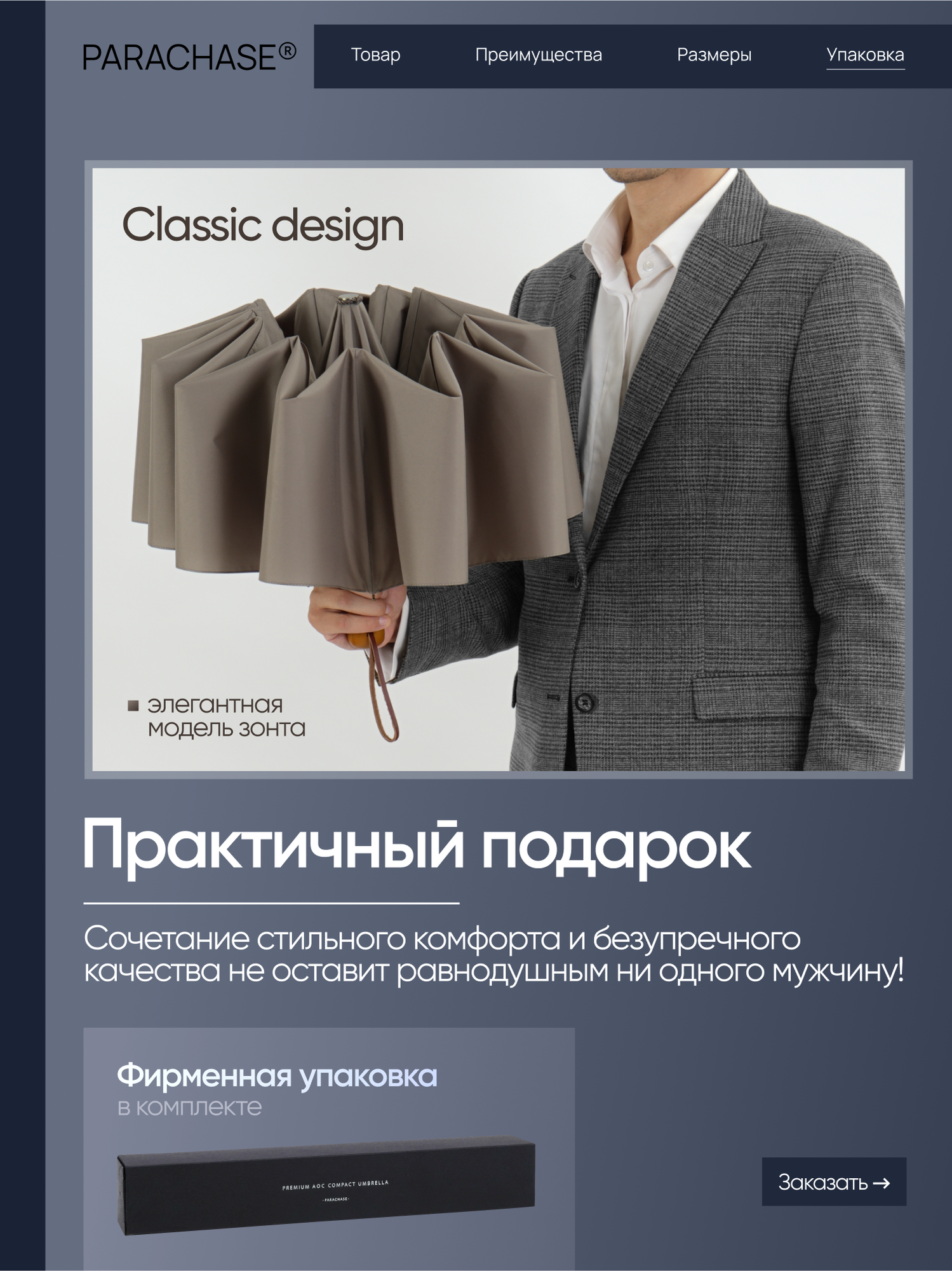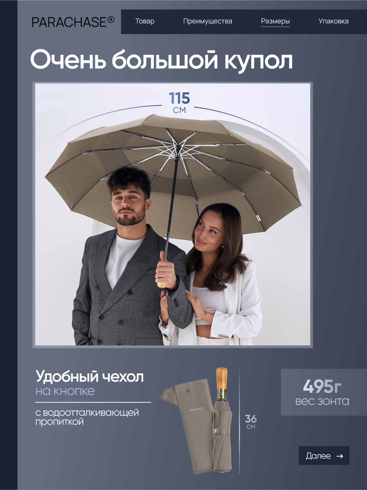 Зонт мужской автомат Parachase с большим куполом/ зонтик мужской автоматический складной большой 10 спиц серый
