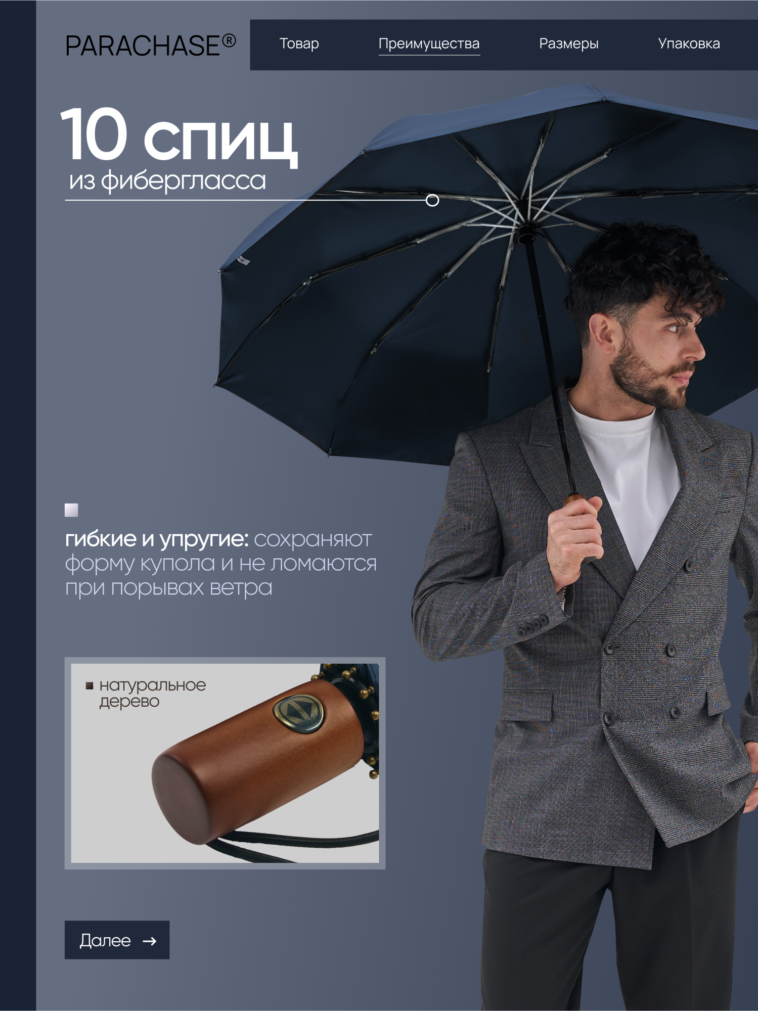 Зонт мужской автомат Parachase с деревянной ручкой/зонтик мужской автоматический с прямой ручкой складной 10 спиц, синий