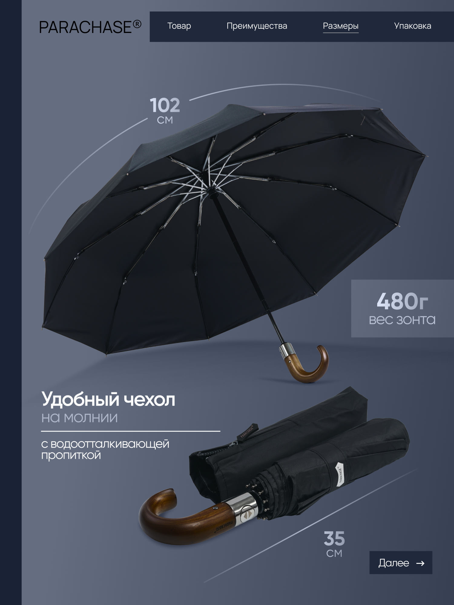 Зонт мужской автомат Parachase с деревянной ручкой крючком / зонтик мужской автоматический с ручкой крючком складной 10 спиц, синий