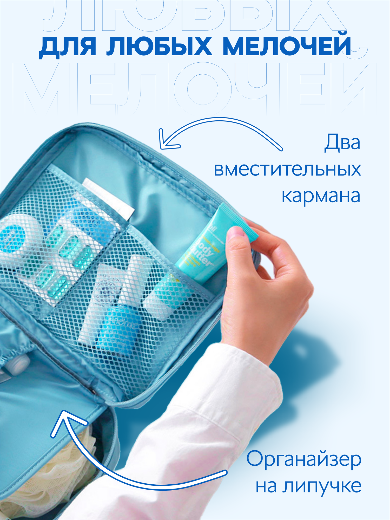 | Дополнительная информация | дорожная косметичка органайзер со съёмным отделом на липучке, непромокаемая, сумочка для путешествий, бьюти кейс, большая косметичка |