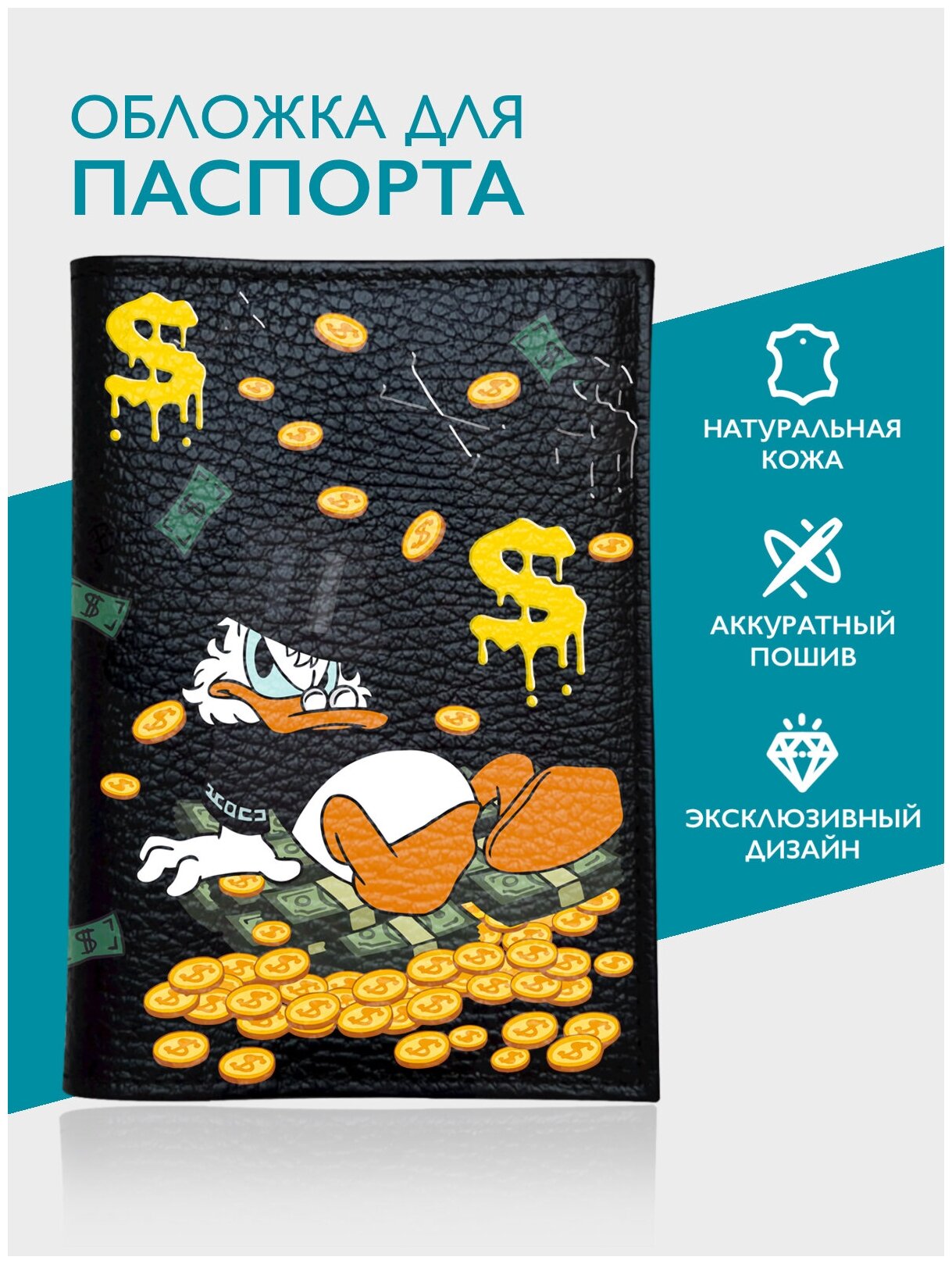 Черная кожаная обложка для паспорта/ загранпаспорта Уточка Девочка