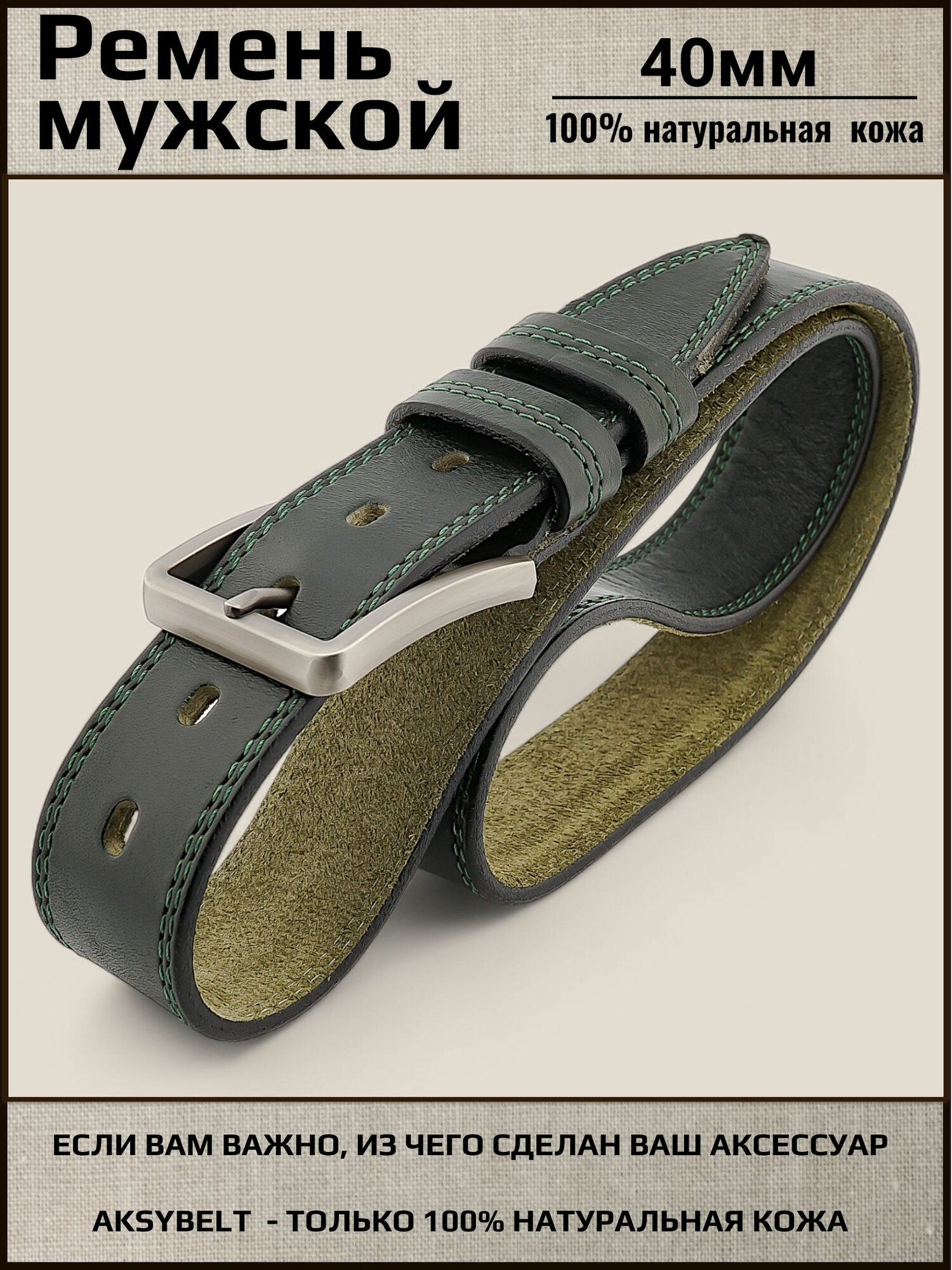 Ремень мужской кожаный Aksy Belt, оливковый, 40мм, прошитый, Италия, 125 см