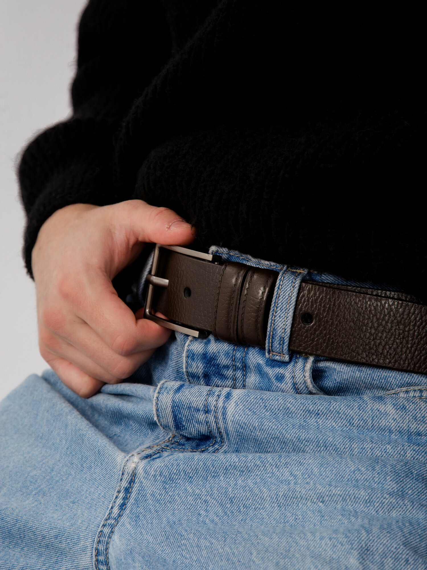 Ремень мужской Кожаный прошитый с пряжкой из натуральной кожи, черный, ширина 4 см