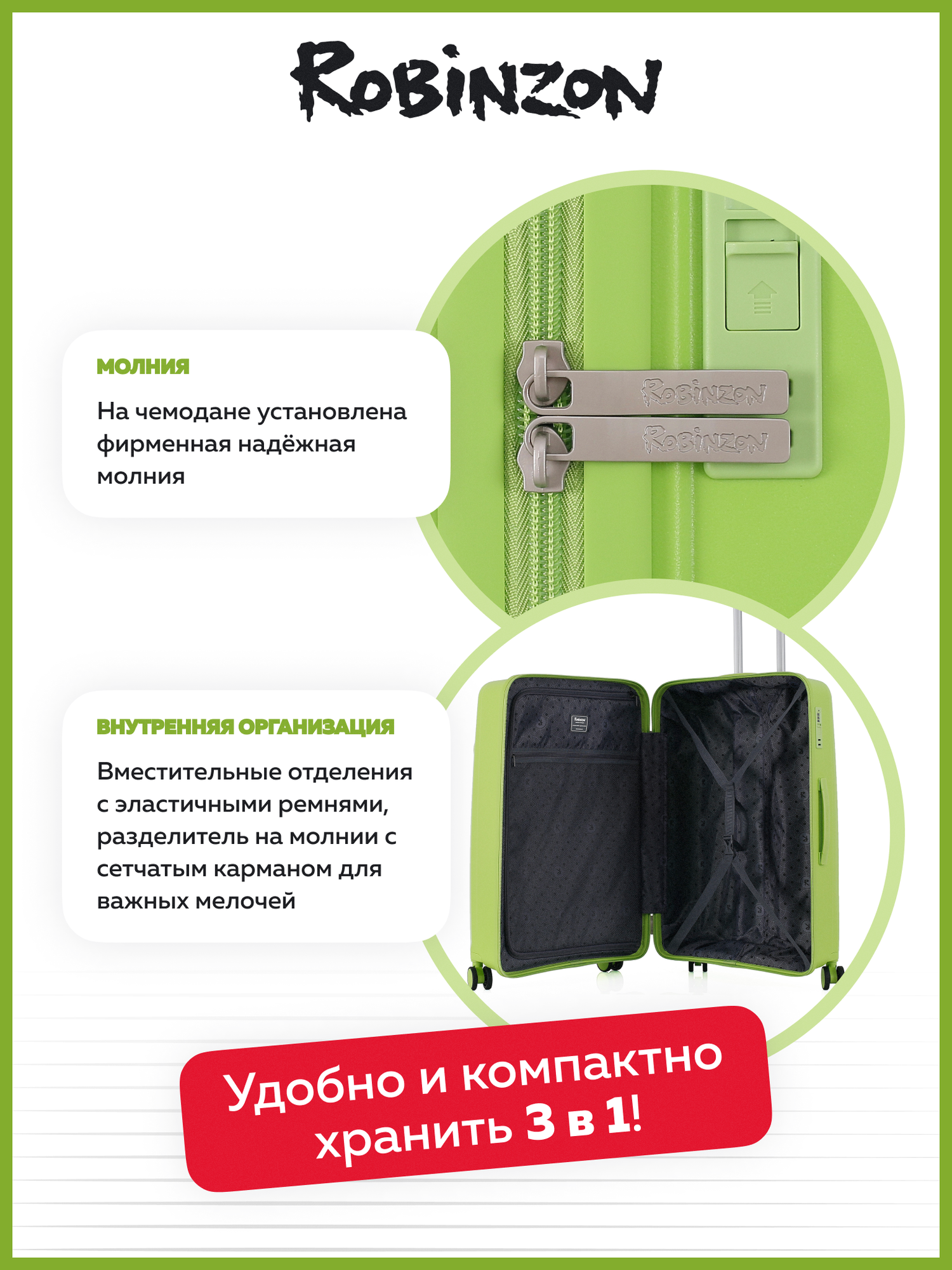 Ниже Вы можете прочитать отзывы на Чемодан Robinzon, 95 л, зеленый, ознакомится с подробными характеристиками, посмотреть интересные обзоры и фотографии на Чемодан Robinzon, 95 л, зеленый.