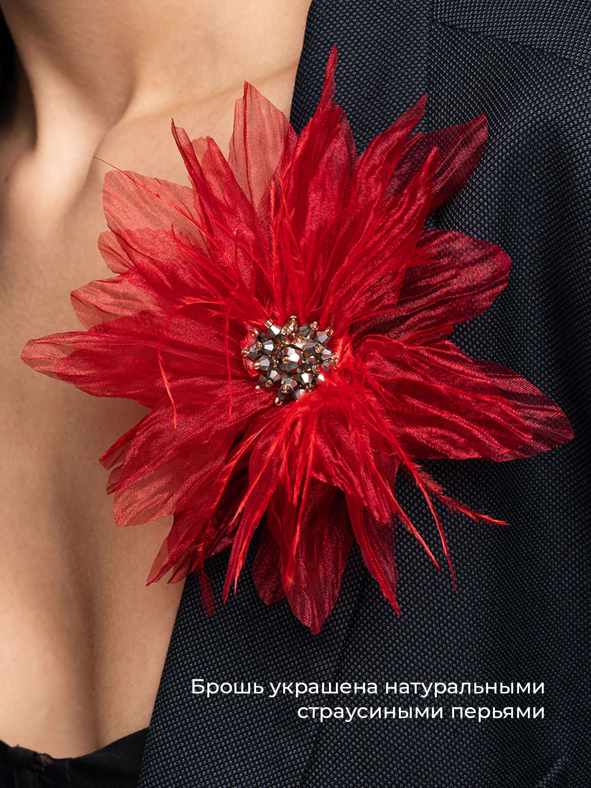 Брошь цветок из ткани с натуральными перьями красная
