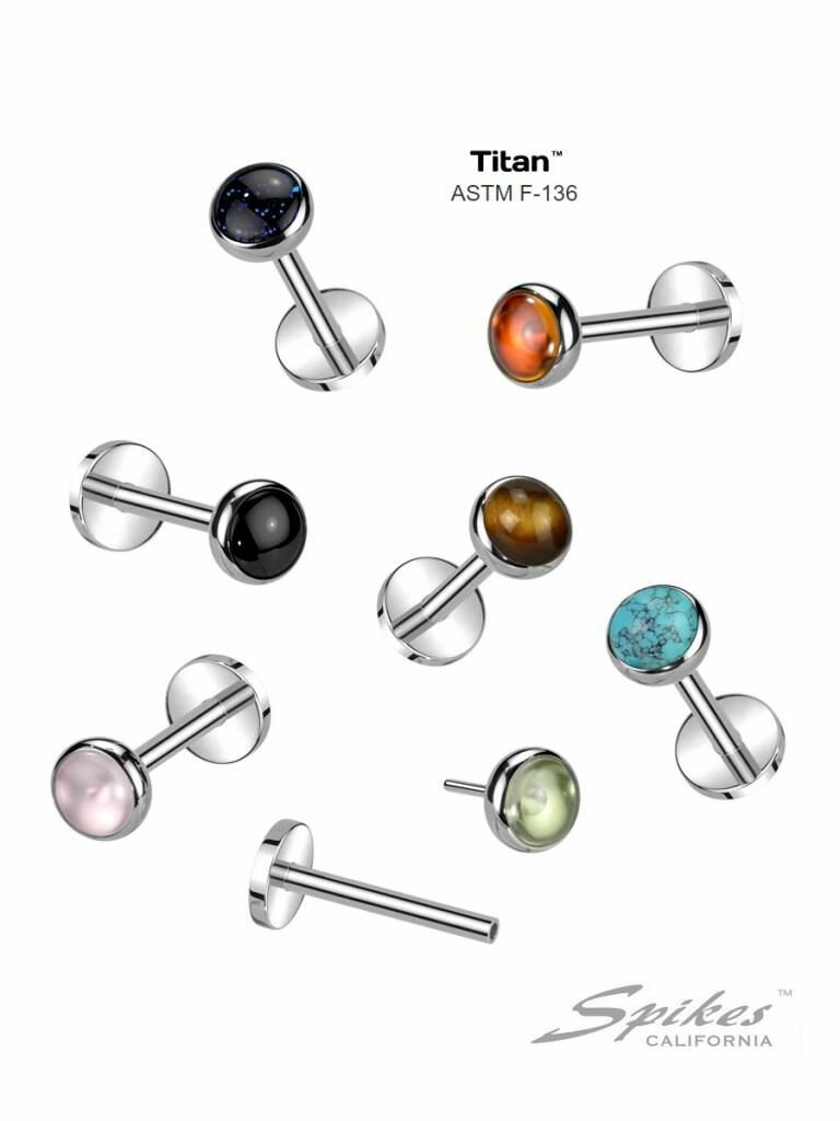 Серьга лабрет для пирсинга уха, губ из титана. Без резьбы, вставка: натуральный камень/тигровый глаз (1*8 мм)