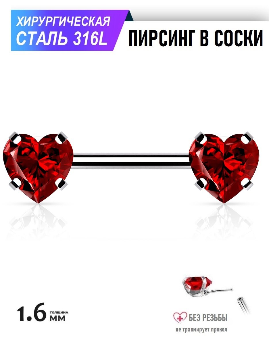 Штанга для сосков, серьга из стали с кристаллами в форме сердца/ красный кристалл, 1.6*12 мм