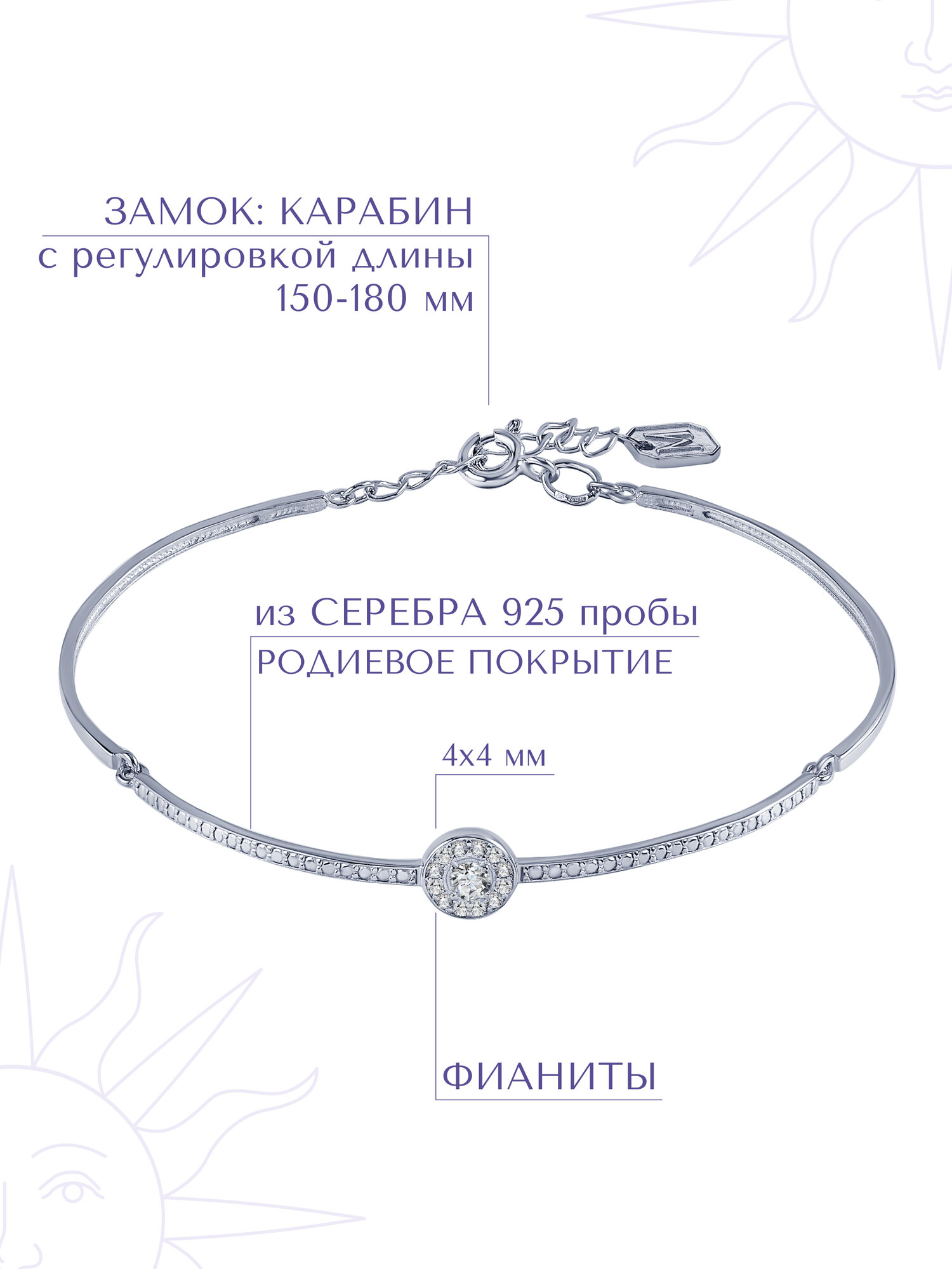 Жесткий браслет MIESTILO, серебро, 925 проба, родирование, фианит, длина 18 см., серебристый интересное: