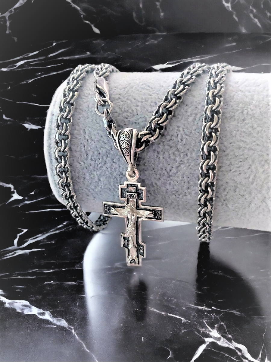 серебряная цепочка мужская Бисмарк с православным крестом 55см