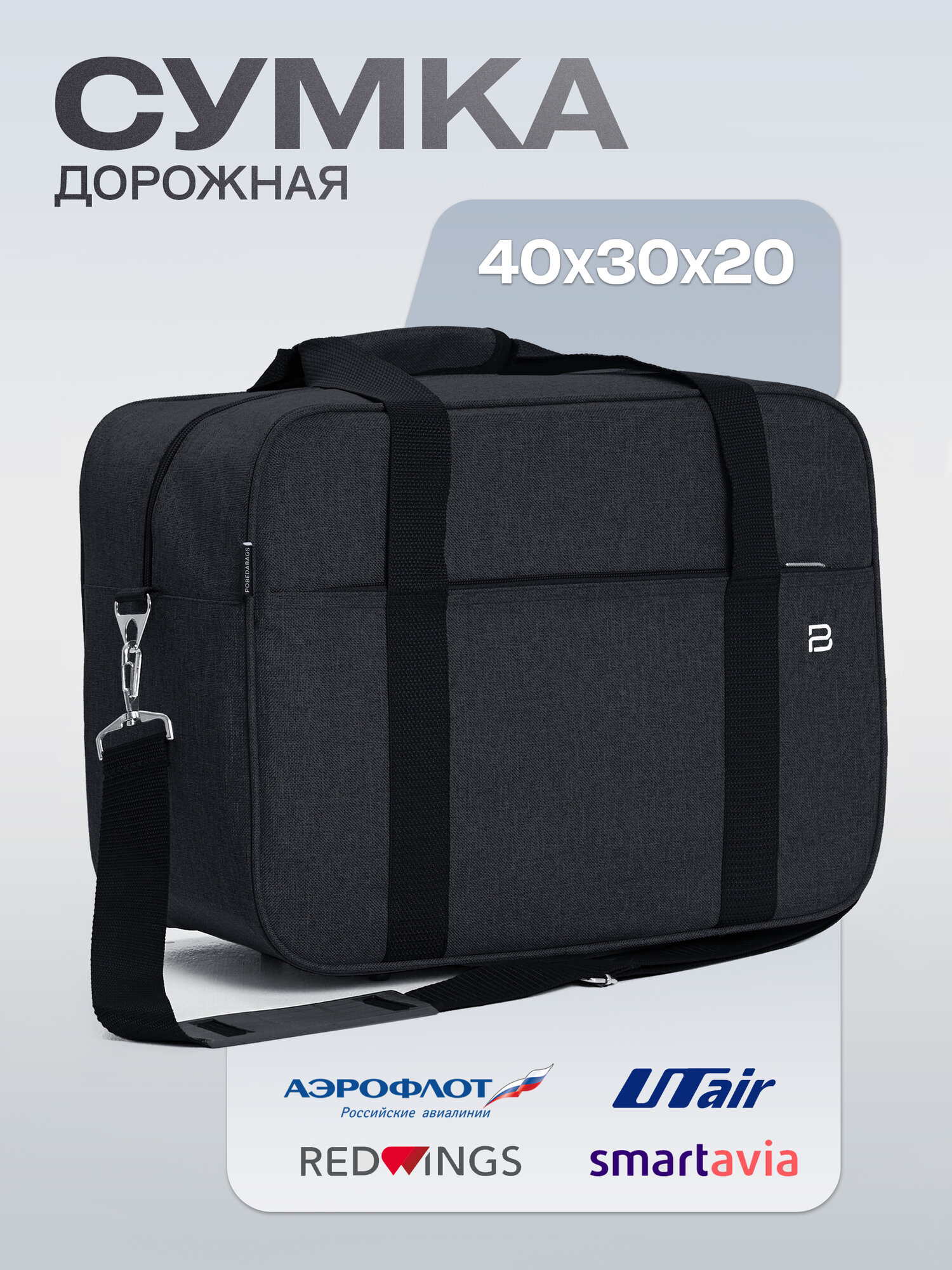Купить Сумка дорожная PobedaBags, 24 л, 20х30х40 см, ручная кладь, черный меланж