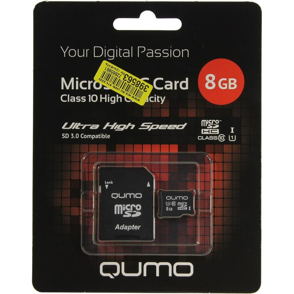Micro SecureDigital 8Gb QUMO QM8GMICSDHC10U1 {MicroSDHC Class 10, SD adapter, UHS-I}