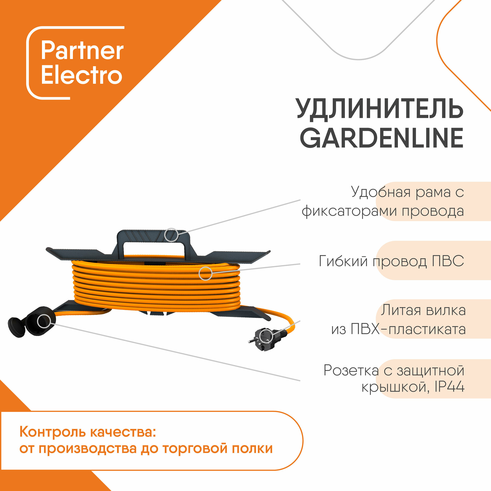 Удлинитель шнур Партнер-Электро GardenLine на рамке б/з ПВС 2х0,75 6A 30м IP 44 оранж.шн
