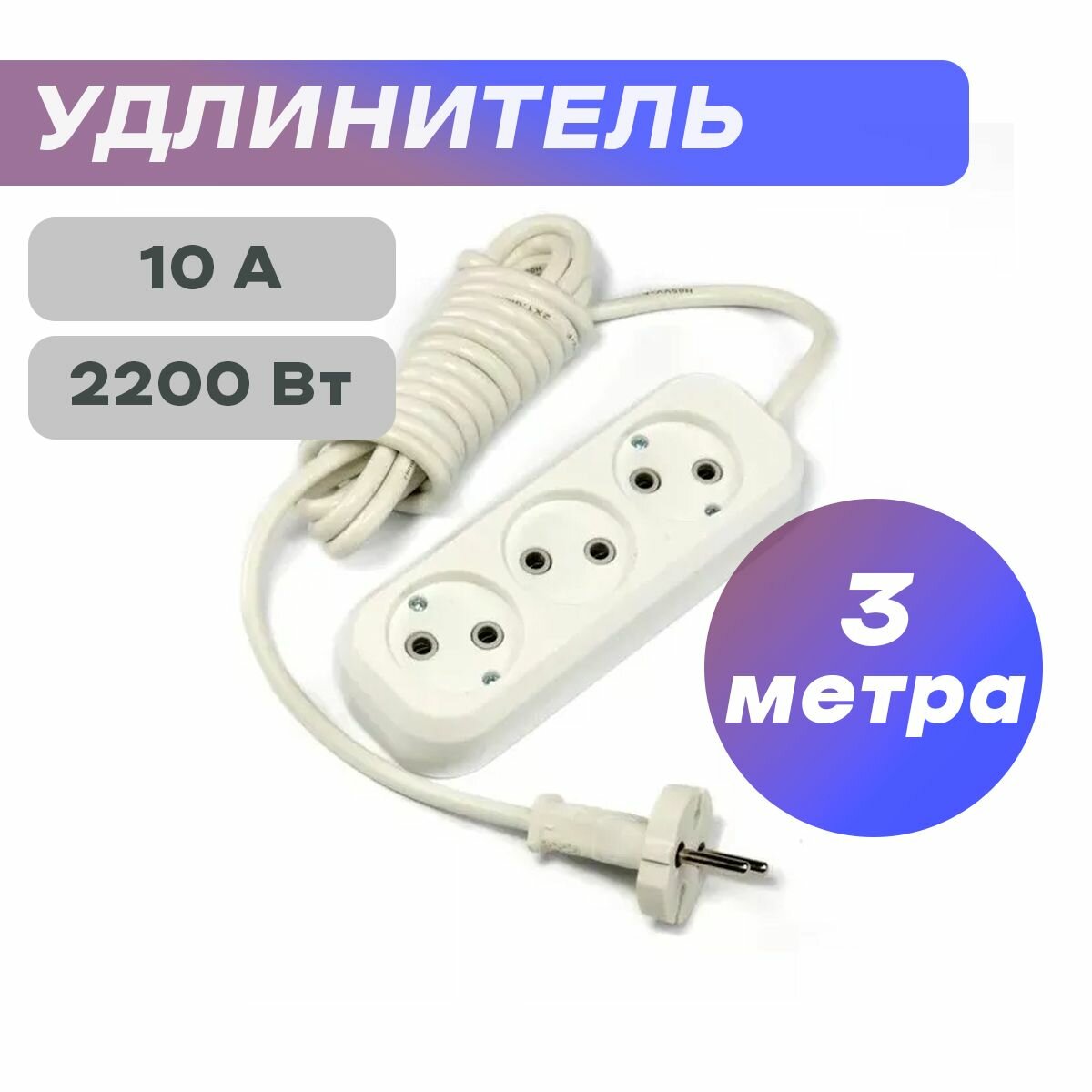 Удлинитель 3 розетки, 10 м, 10 А, 2200 Вт, ПВС 2х1 мм2, без з/к, белый