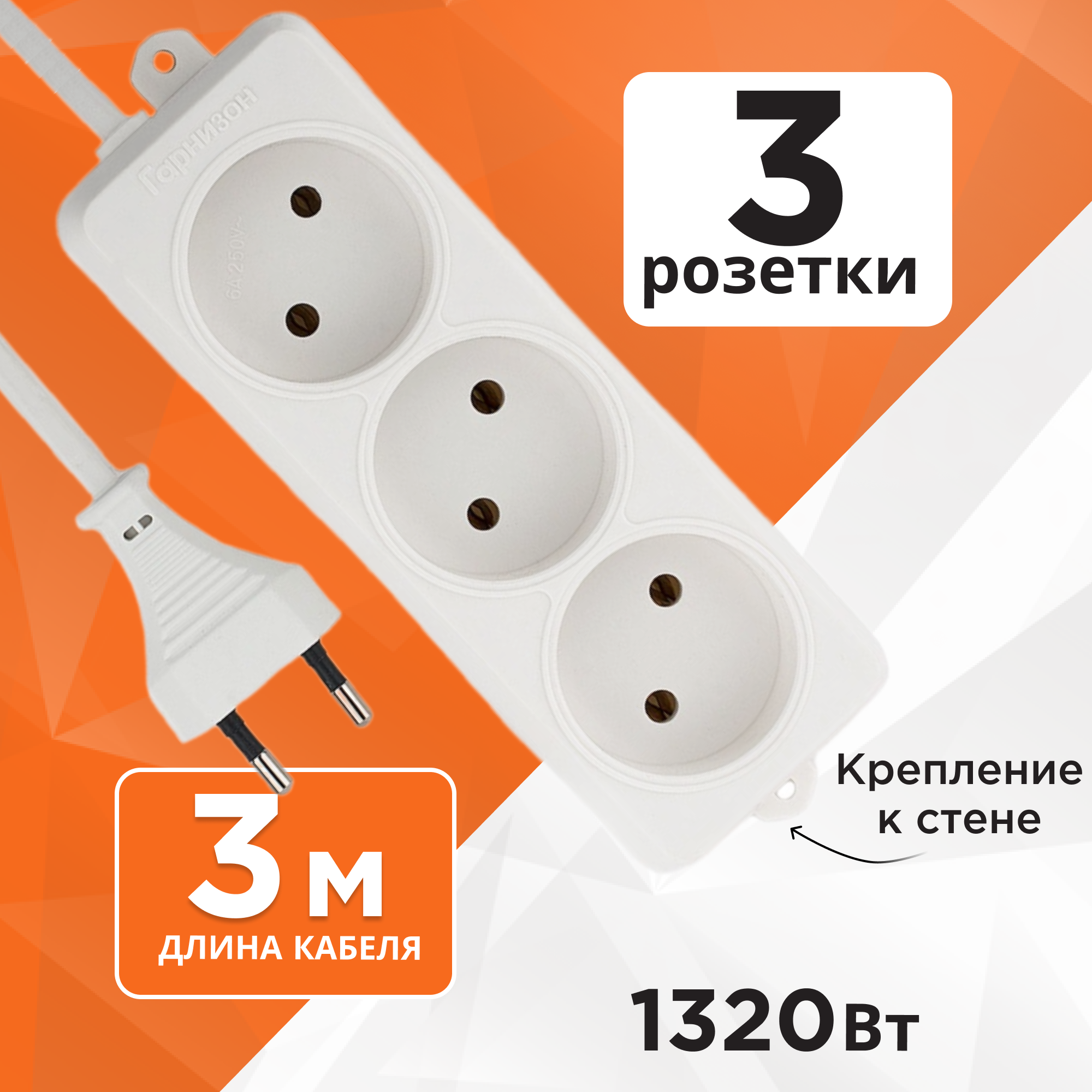 Удлинитель Гарнизон EL-E3-W-3, 3 розетки, б/з, 6А / 1300 Вт белый 3 м 0.75 м² 3