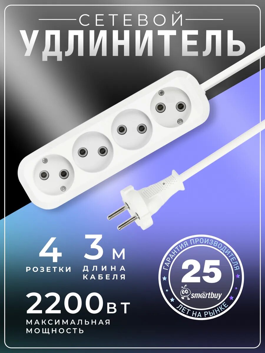 СохранитьУдлинитель Smartbuy, 4 гнезда 3 метра 10А/2,2кВт без заземления ПВС 2х1,0 (SBE-10-4-03-N) /40 интересное: