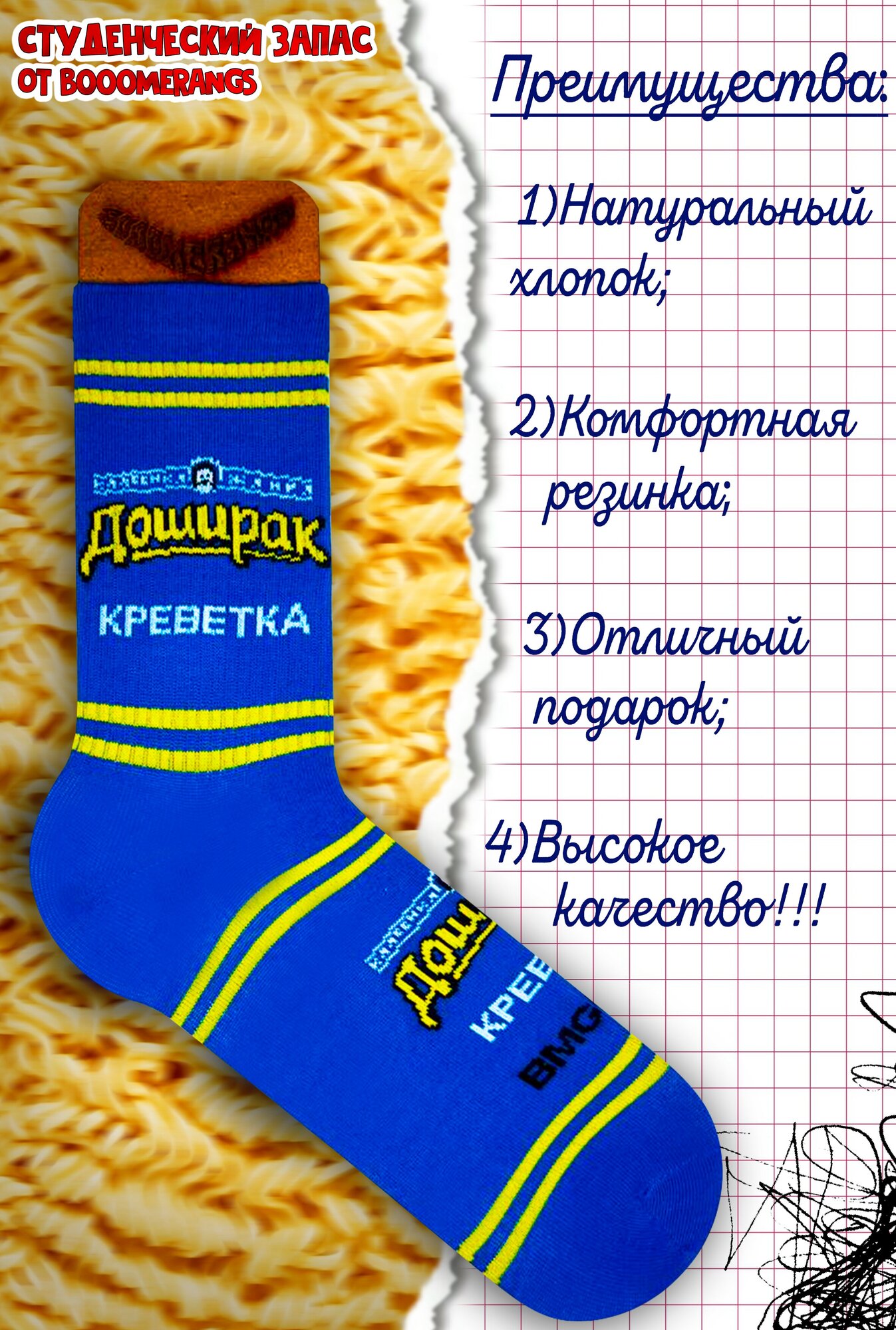 Синие носки с веселым принтом Доширак креветка мечта студента прикольный подарок от BMGBRAND