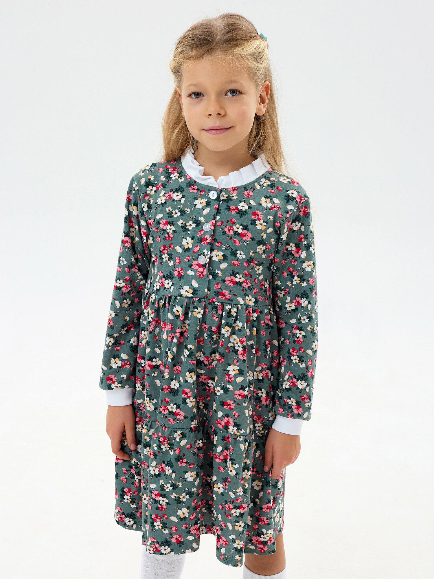 Легкое платье с длинным рукавом, зеленая полянка, размер 122