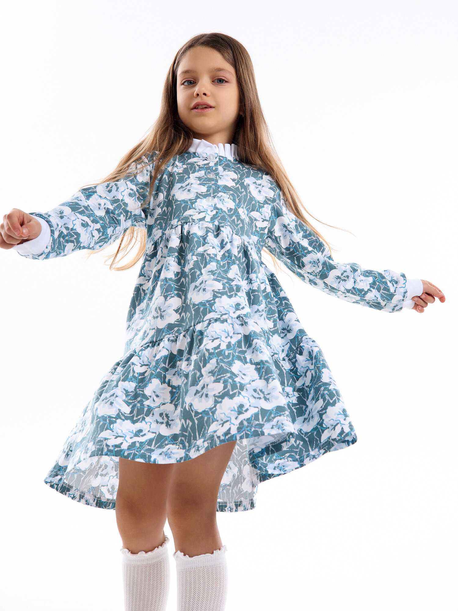 Легкое платье с длинным рукавом, зеленая полянка, размер 122