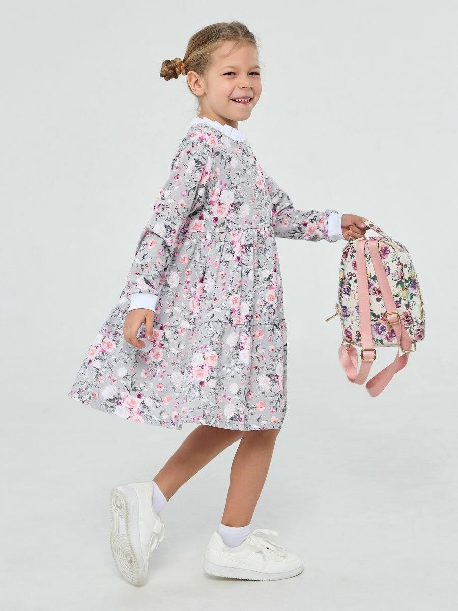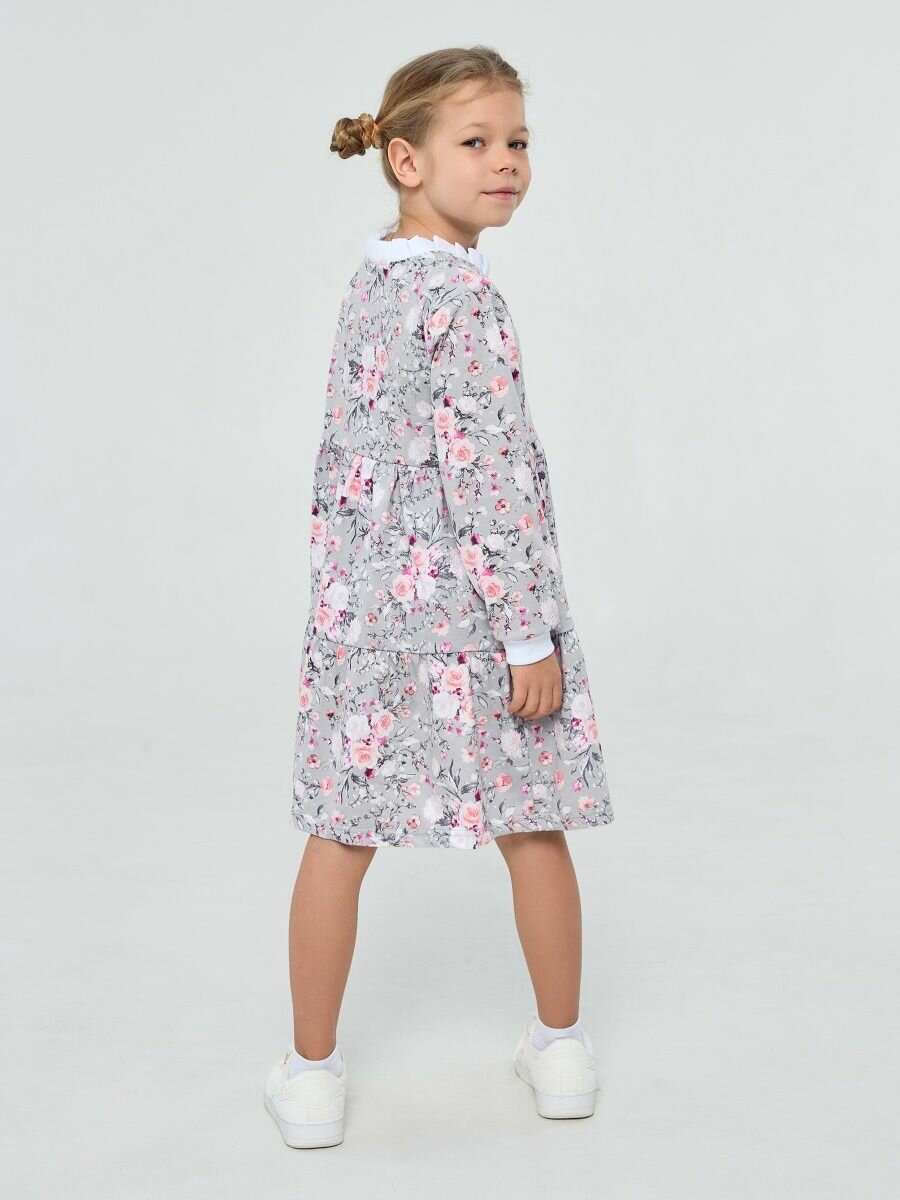 Легкое платье с длинным рукавом, cерые цветы, размер 122
