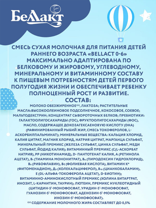 | Состав | молоко обезжиренное / лактоза / растительные масла (высокоолеиновое подсолнечное / кокосовое / соевое) / концентрат сывороточных белков / пребиотики: олигогалактоза (ГОС) / олигофруктоза (ФОС) / масло / содержащее докозагексагеновую кислоту (DHA) (рафинированный рыбий жир / смесь токоферолов / аскорбил пальмитат); минеральные вещества / витамины / таурин / лютеин / премикс нуклеотидный: цитидин-5'-монофосфат / уридин-5'-монофосфат / гуанозин-5'-монофосфат / аденозин-5'-монофосфат / инозин-5'-монофосфат |