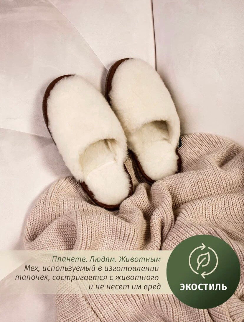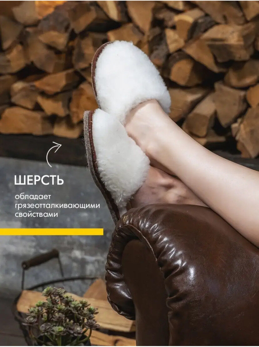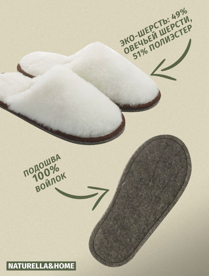 Тапочки домашние из овечьей шерсти на подошве из войлока, тапки меховые плюшевые, Naturella&Home, белые, 43-44